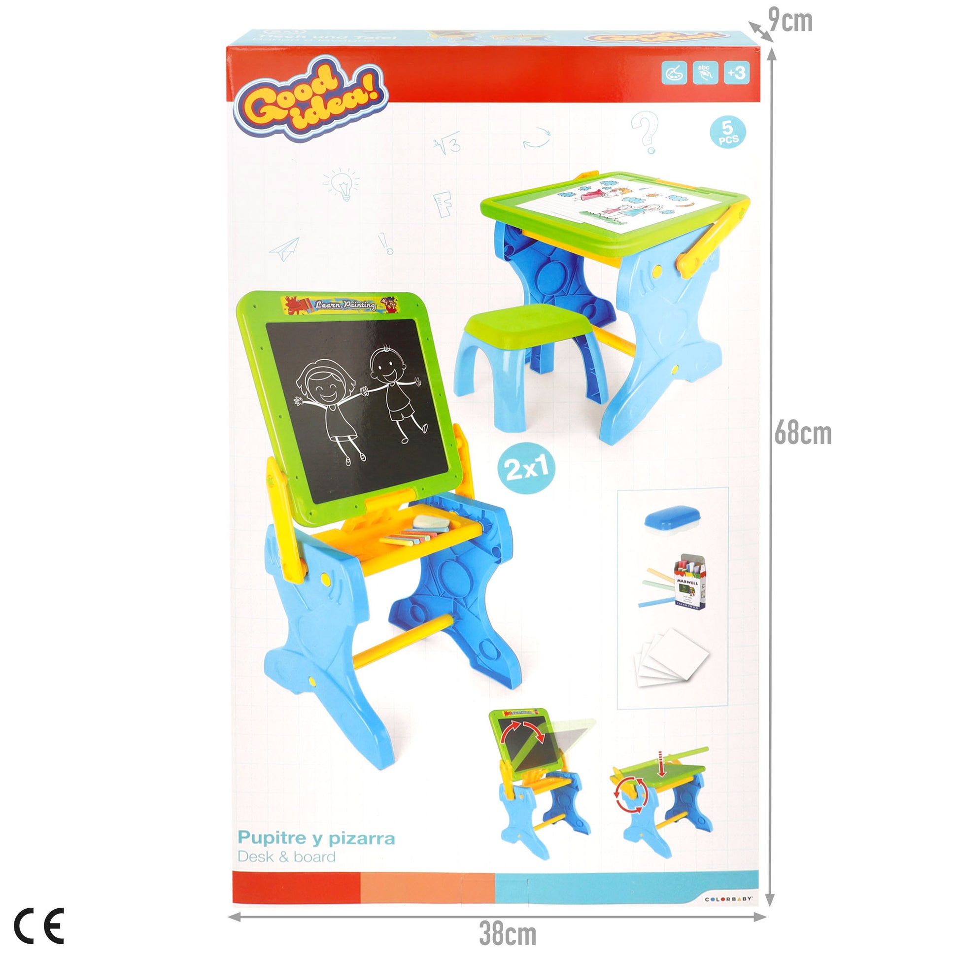 El set contiene la pizarra 2 en 1, el taburete y accesorios como tizas de colores para que creen diseños con su imaginación, un borrador para que dibujen tantas veces como quieran y 4 láminas para que cuando se convierta en escritorio puedan dibujar y guardar sus pequeñas obras de arte.