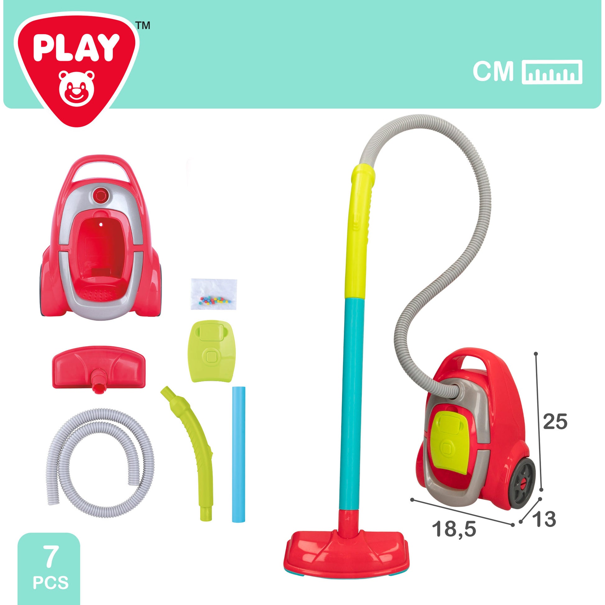 ¡Deja tu casa como nueva con esta aspiradora de juguete PLAY! Emite sonidos y succiona como las aspiradoras de verdad y tiene un diseño con colores vivos y llamativos. Su manguera se puede desmontar en 3 partes y cuenta con dos ruedas traseras y un asa que sirven para poder moverla con facilidad y, también, para poder para poder transportarla de una lado a otro. ¡Es muy realista! Se trata de un juguete simbólico perfecto para que los peques adquieran hábitos domésticos, mientras dejan volar su imaginación y mejoran su habilidad manual.