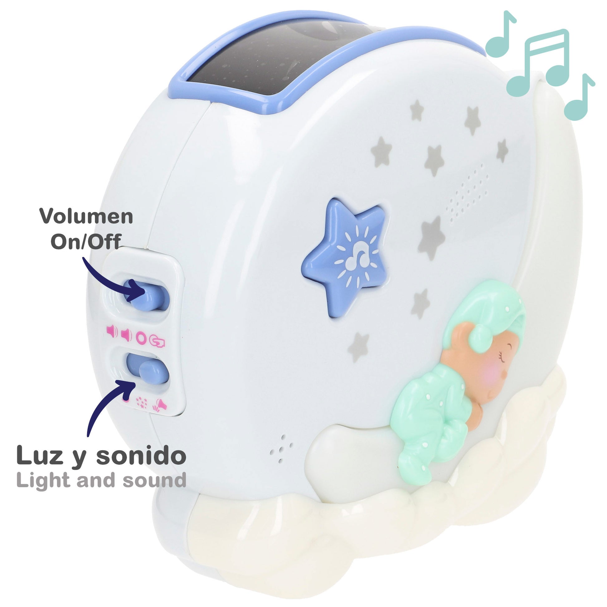 Este set incorpora un proyector portátil con asa para colgar fácilmente en la cuna, un panel frontal con botón de activación de melodías y controles laterales para el volumen y los modos de luz. Su diseño de colores suaves y formas redondeadas lo convierte en un accesorio seguro y encantador para el entorno del bebé.