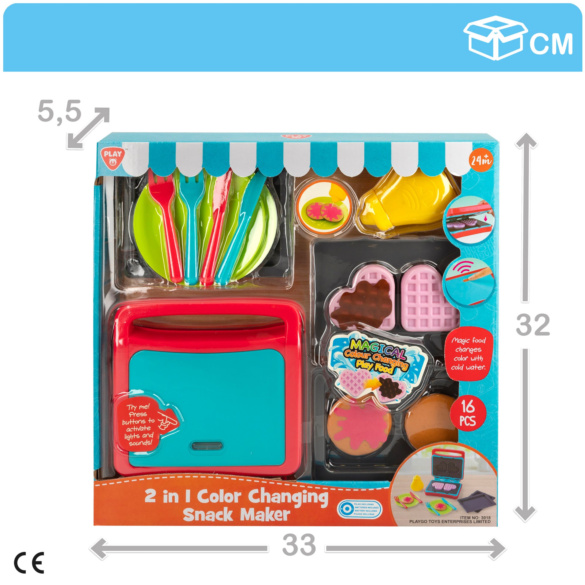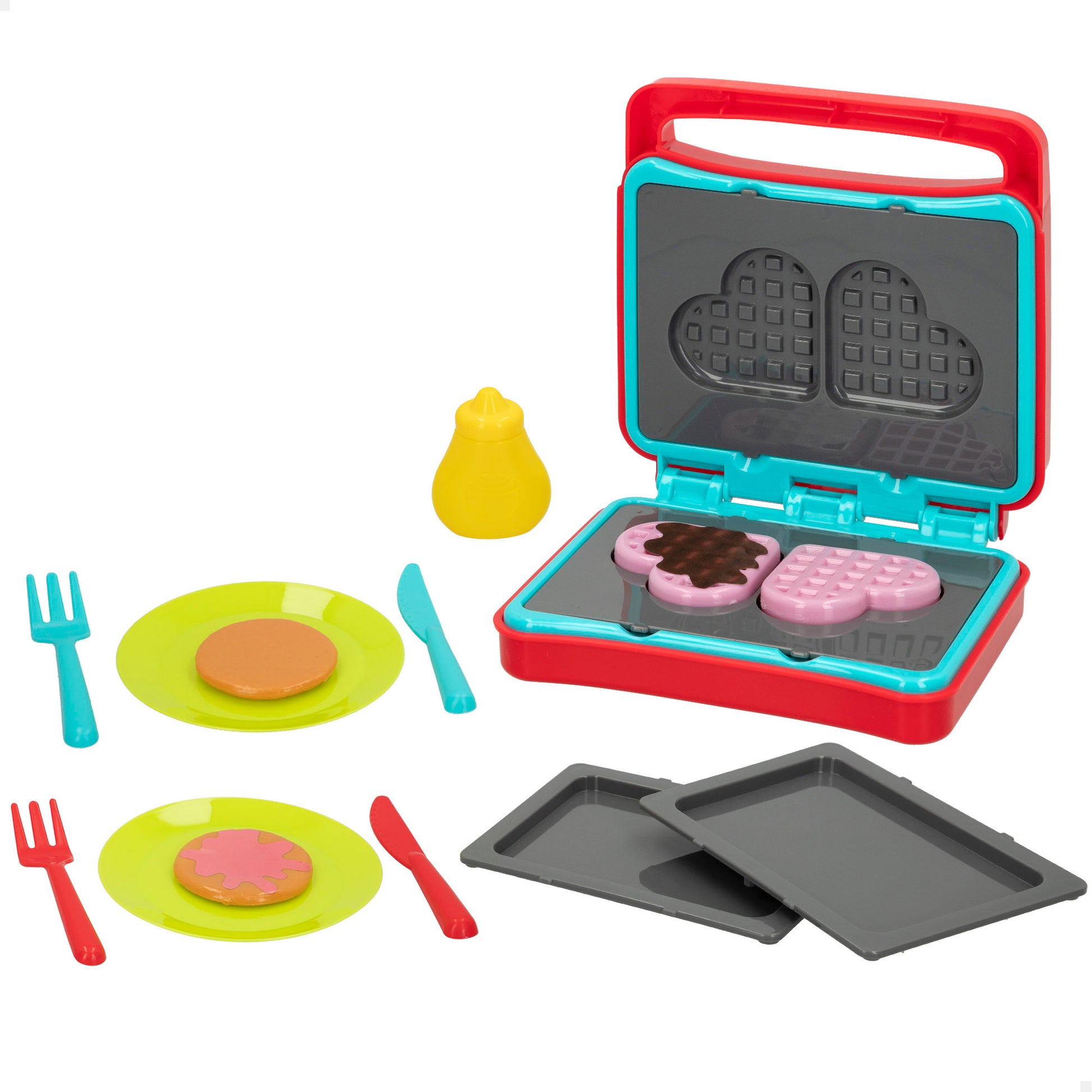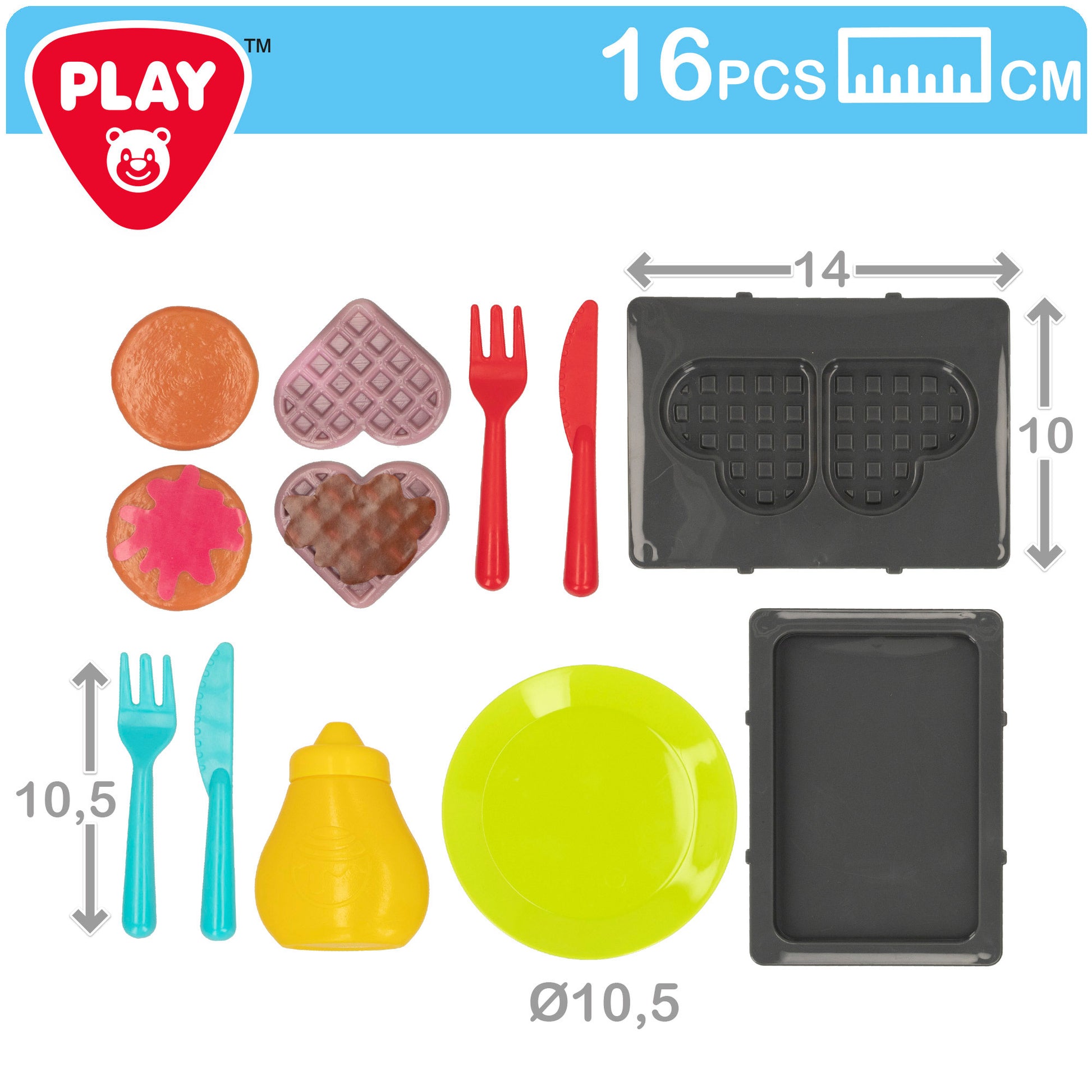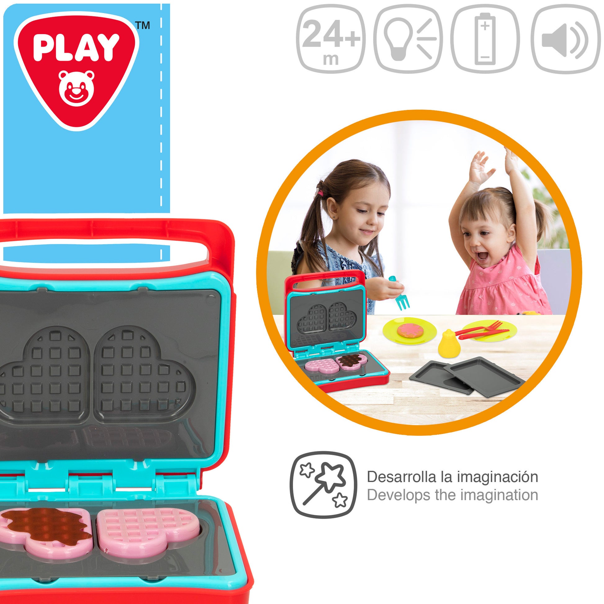 Prepara el desayuno con la sandwichera eléctrica de PLAY. Contiene 2 gofres en forma de corazón, 2 tortitas, 2 platos 2 set de cubiertos, 2 bandejas y un bote de sirope ¡qué rico! Además hace sonidos y luces. Funciona con 2 pilas AAA (incluidas). Desarrolla la imaginación, fomenta el aprendizaje de labores del hogar. Para niños a partir de los 2 años de edad.