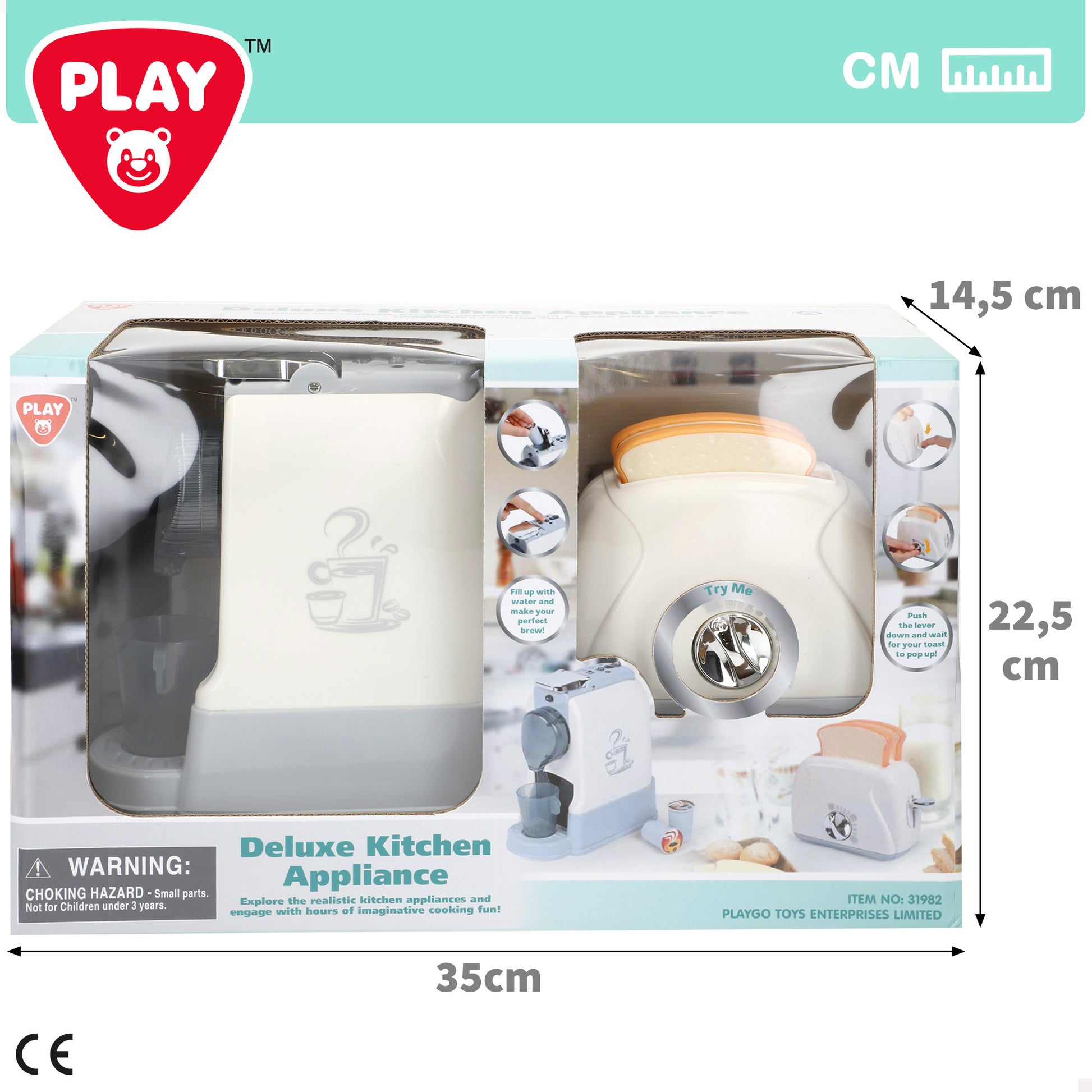 Con el set de cafetera y tostadora PLAY podrás preparar desayunos como los mayores. Introduce las rebanadas de pan en la tostadora y mira cómo saltan solas, pulsa los botones de la cafetera y escucha cómo hace el café. ¡Todo parece de verdad! Un juego divertido para que inventes tus propios desayunos y los compartas con quien quieras.