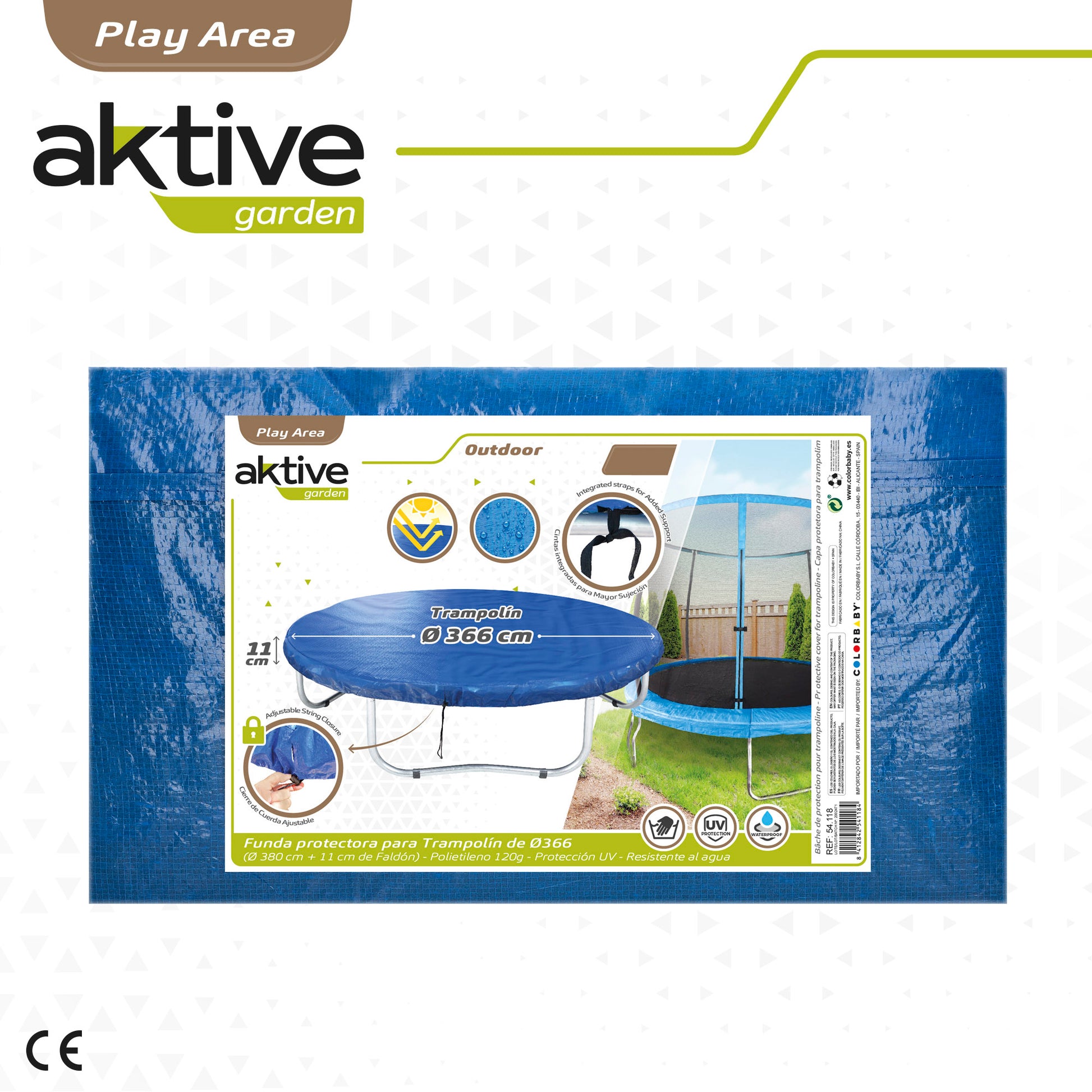 Protege la cama elástica exterior de tu peque con el cobertor de colchonetas elásticas Aktive. Con ella alargaras la vida útil de la cama elástica y manteniendo así el buen estado de los materiales. Está fabricada con polietileno en color azul, con medidas 366 cm de diámetro y 11 cm de voladizo. Incluye sistema de cierre regulable y cintas para ajustarla perfectamente a la estructura del trampolín. Solamente cubre la superficie de salto.