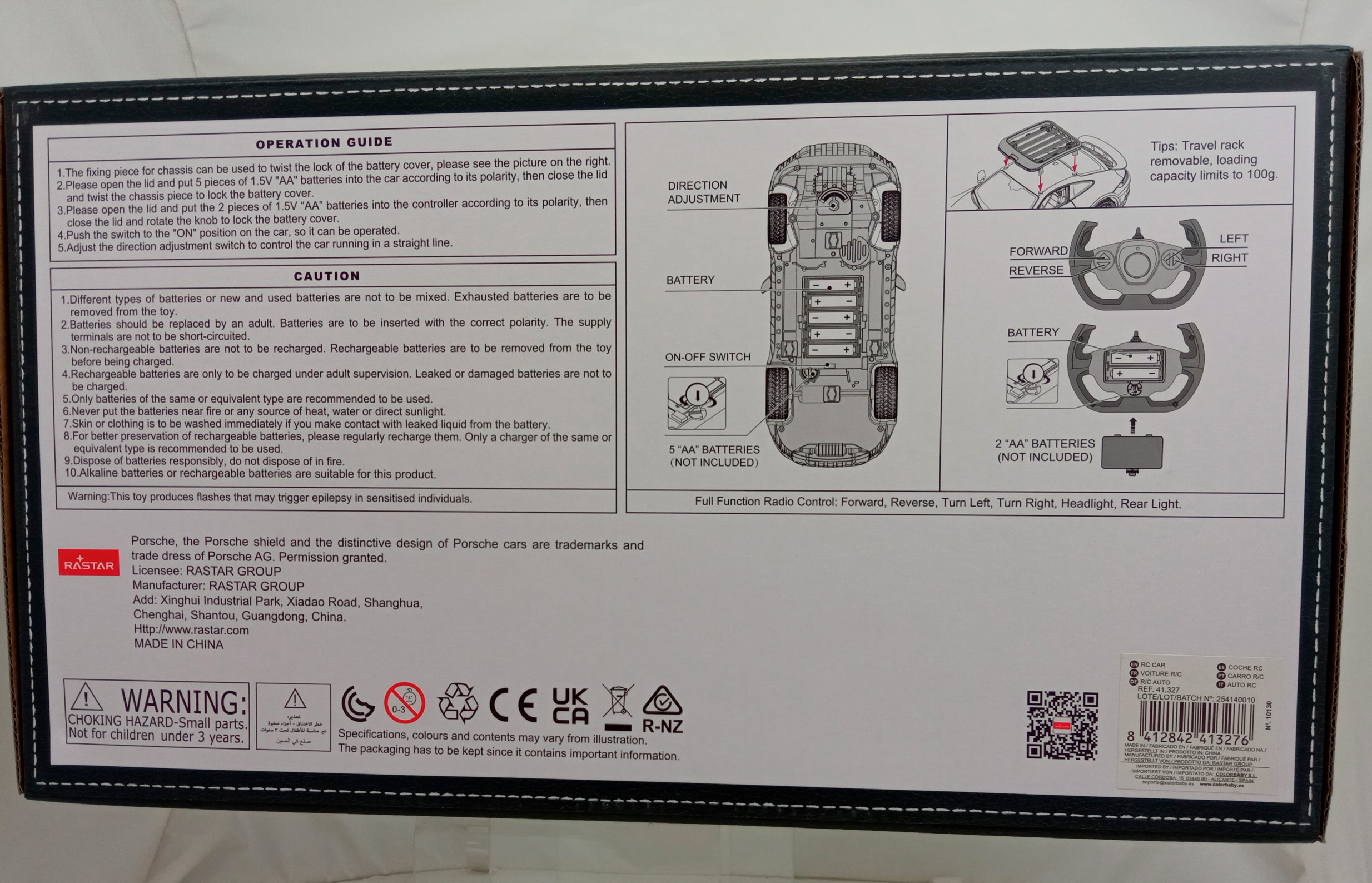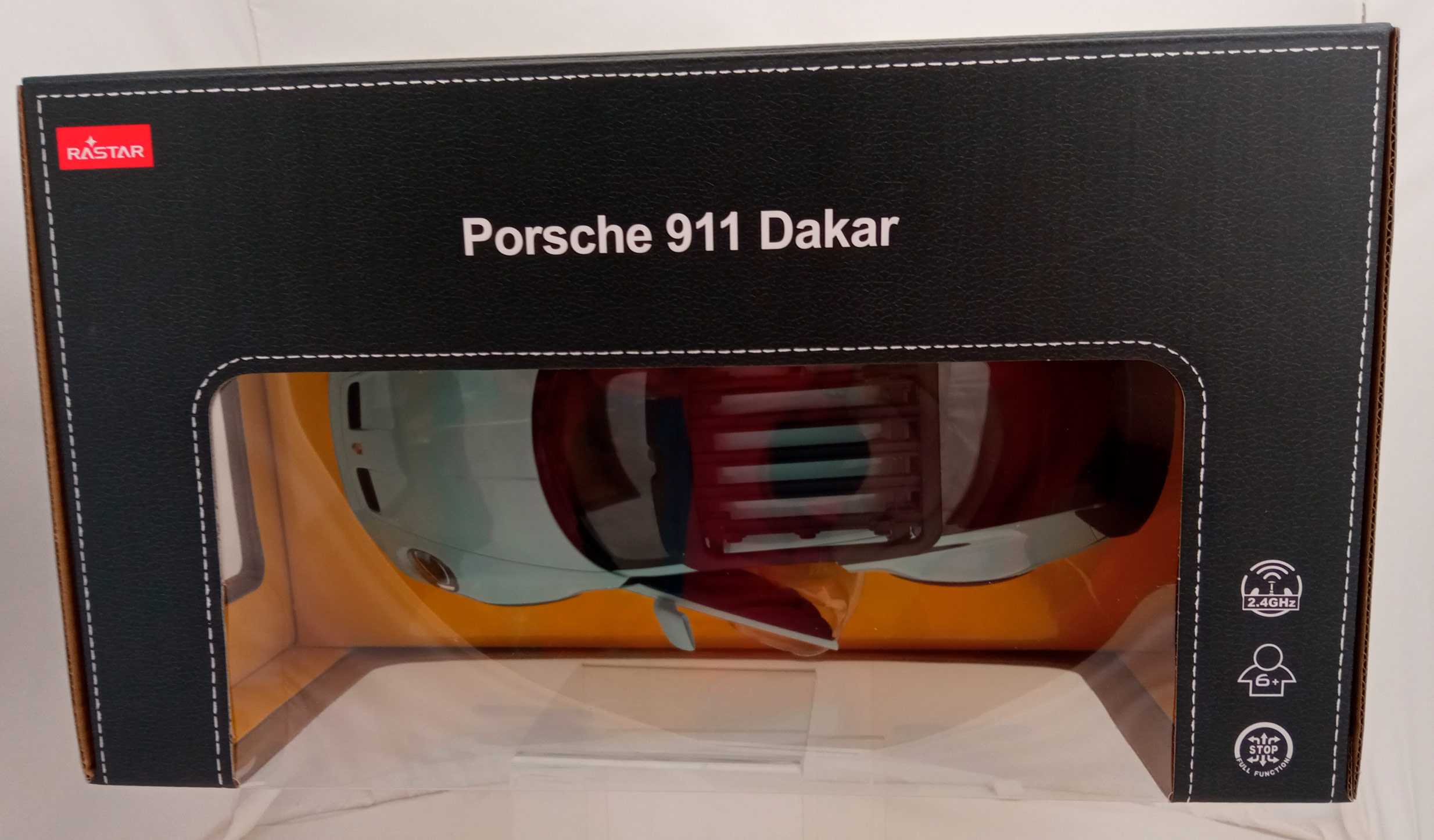 Incluye un coche teledirigido Porsche 911 Dakar en color Shade Green con acabados realistas, control remoto de frecuencia 2.4 GHz y detalles exclusivos como portaequipajes desmontable y puertas que se abren a mano. Funciona con 5 pilas AA para el coche y 2 pilas AA para el mando (no incluidas).