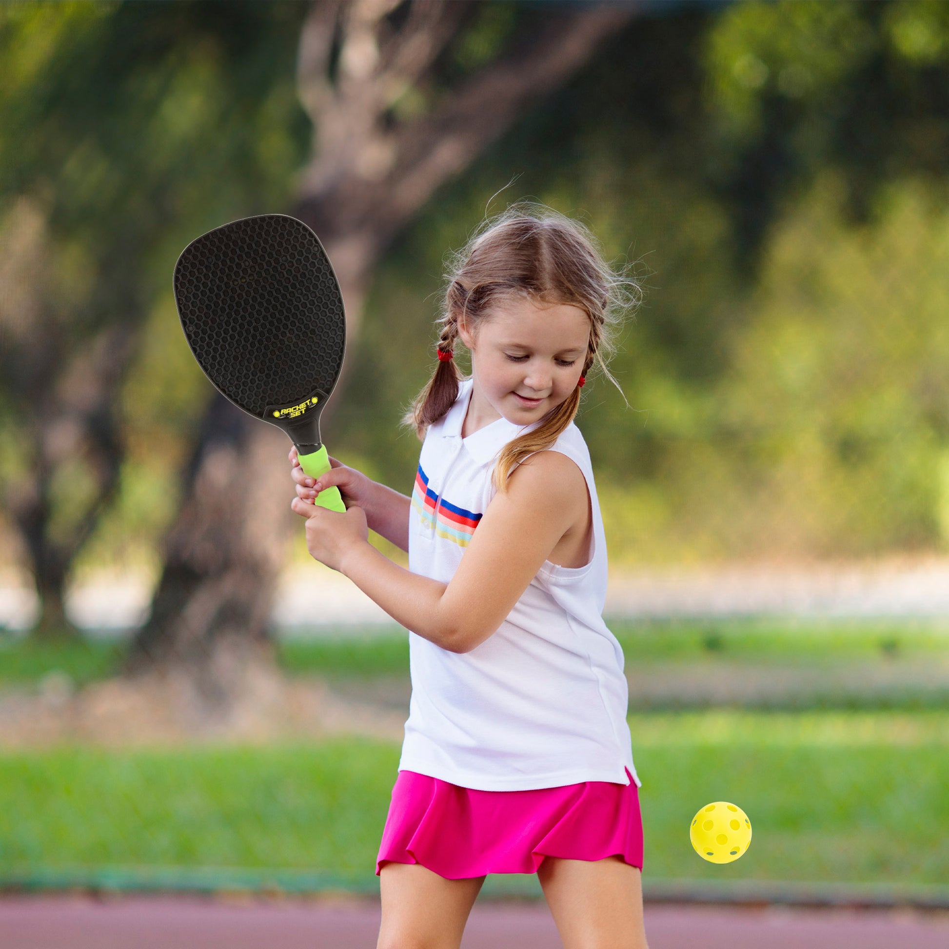 El set se compone de dos palas de playa, fabricadas de PVC con mangos de espuma para un agarre más suave y cómodo y una pelota color amarillo de PVC, que garantiza una mayor precisión y control en cada pase, ¡ideal para las partidas más divertidas al aire libre!