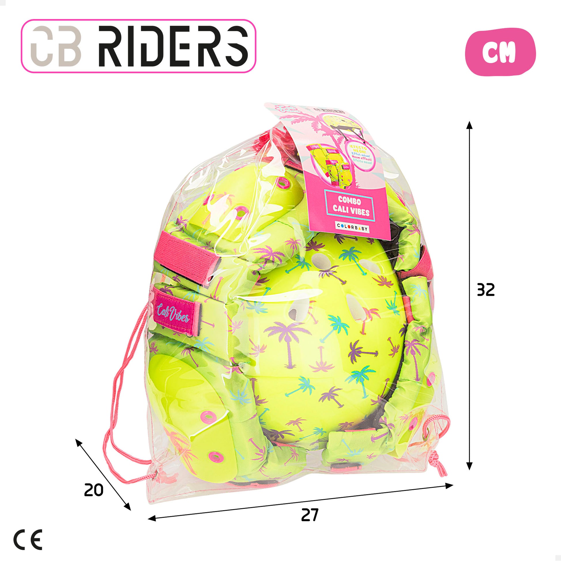 ¡Revive la emocionante escena de playa de Barbie y Ken, en la película Barbie 2023, con este deslumbrante conjunto de casco, coderas y rodilleras CB Riders! ¡Similares a los que llevan los protagonistas en la película! Son accesorios modernos y sofisticados, diseñados en un espectacular y llamativo color amarillo neón con detalles en rosa y estampado de palmeras. ¡Todo glamour!