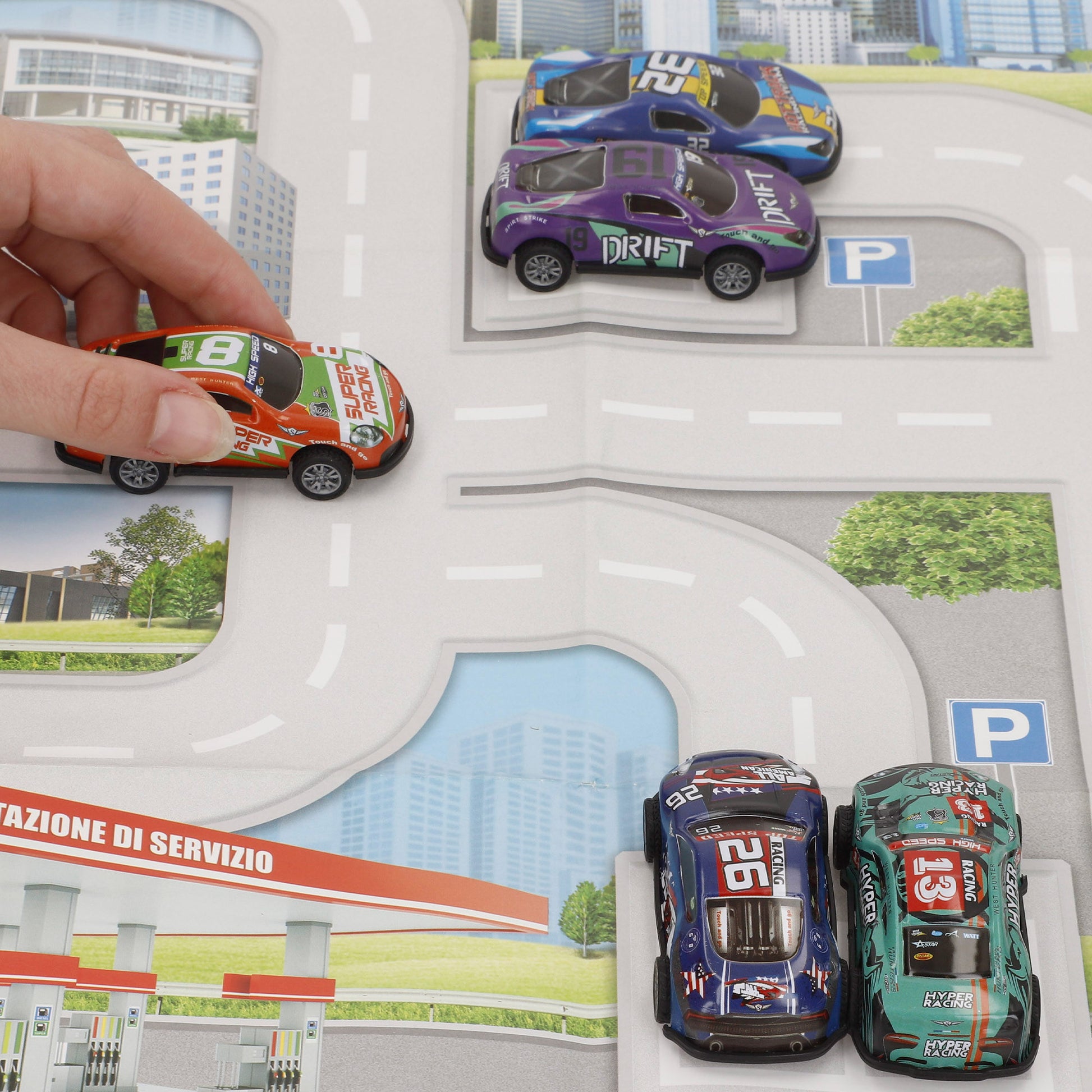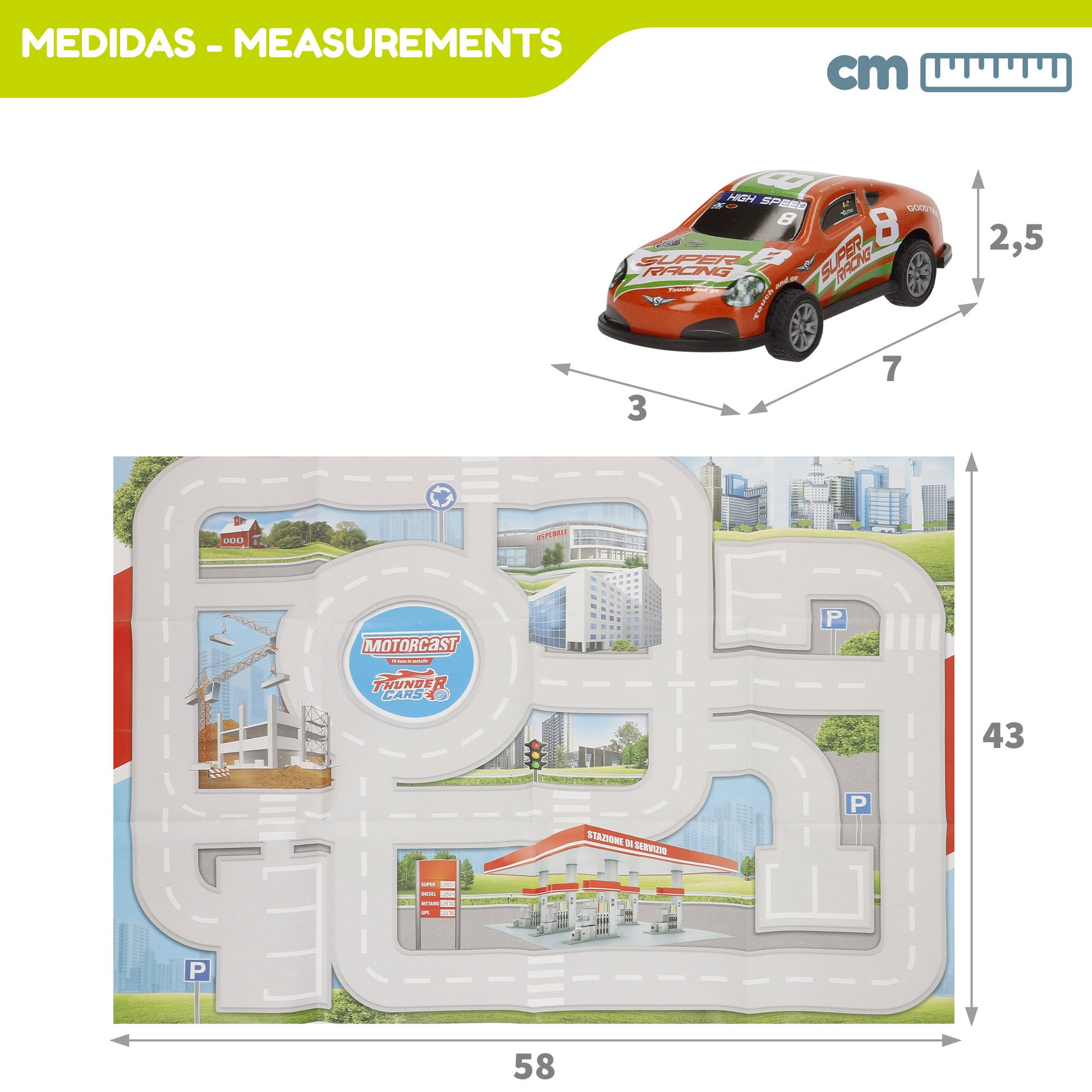 Este completo set contiene un circuito de ciudad para que los niños desplieguen su creatividad y jueguen durante horas. Incluye accesorios como 13 coches a escala 1:87 fabricados de metal y plástico, 1 camión y 8 señales de tráfico con los que podrán crear escenarios llenos de acción. Los vehículos funcionan con sistema de fricción, lo que permite lanzarlos a toda velocidad por el circuito con solo empujarlos hacia atrás y soltarlos. ¡Prepárate para horas interminables de aventuras y diversión sin fin!
