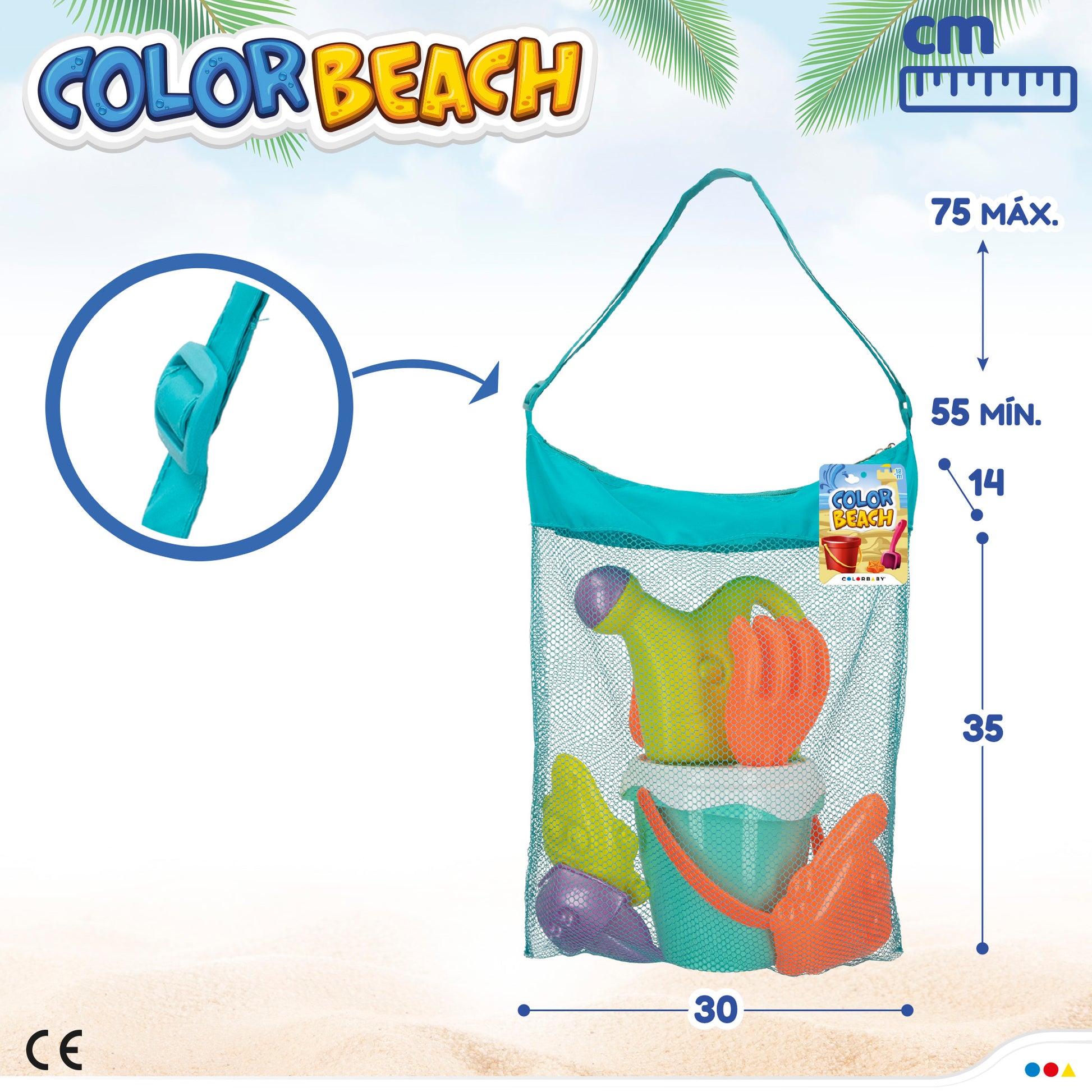 ¡En la playa no pueden faltar los juguetes para pasar un día divertido! Esta bolsa de playa con rejilla y asa regulable incorpora un cubo de arena de 14 cm de diámetro, un cedazo, una pala, un rastrillo, una regadera y 3 moldes de barco y animalitos de agua. A partir de 18 meses.