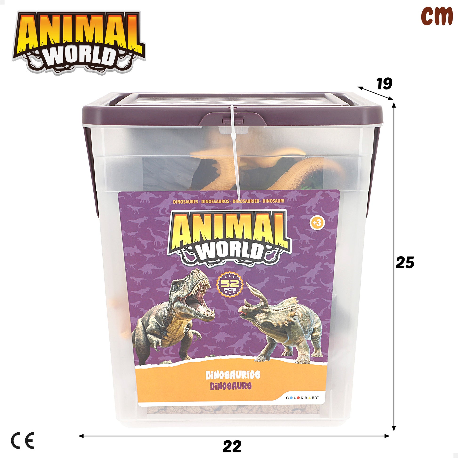 52 piezas: figuras de dinosaurios (hasta 12 cm; T-Rex, Triceratops, Velociraptor, Pterosaurios…), árboles, rocas, troncos, nidos con huevos, vallas y tapete de juego. Todo se guarda en un cubo transparente con tapa y asa para ordenar y llevar fácilmente.