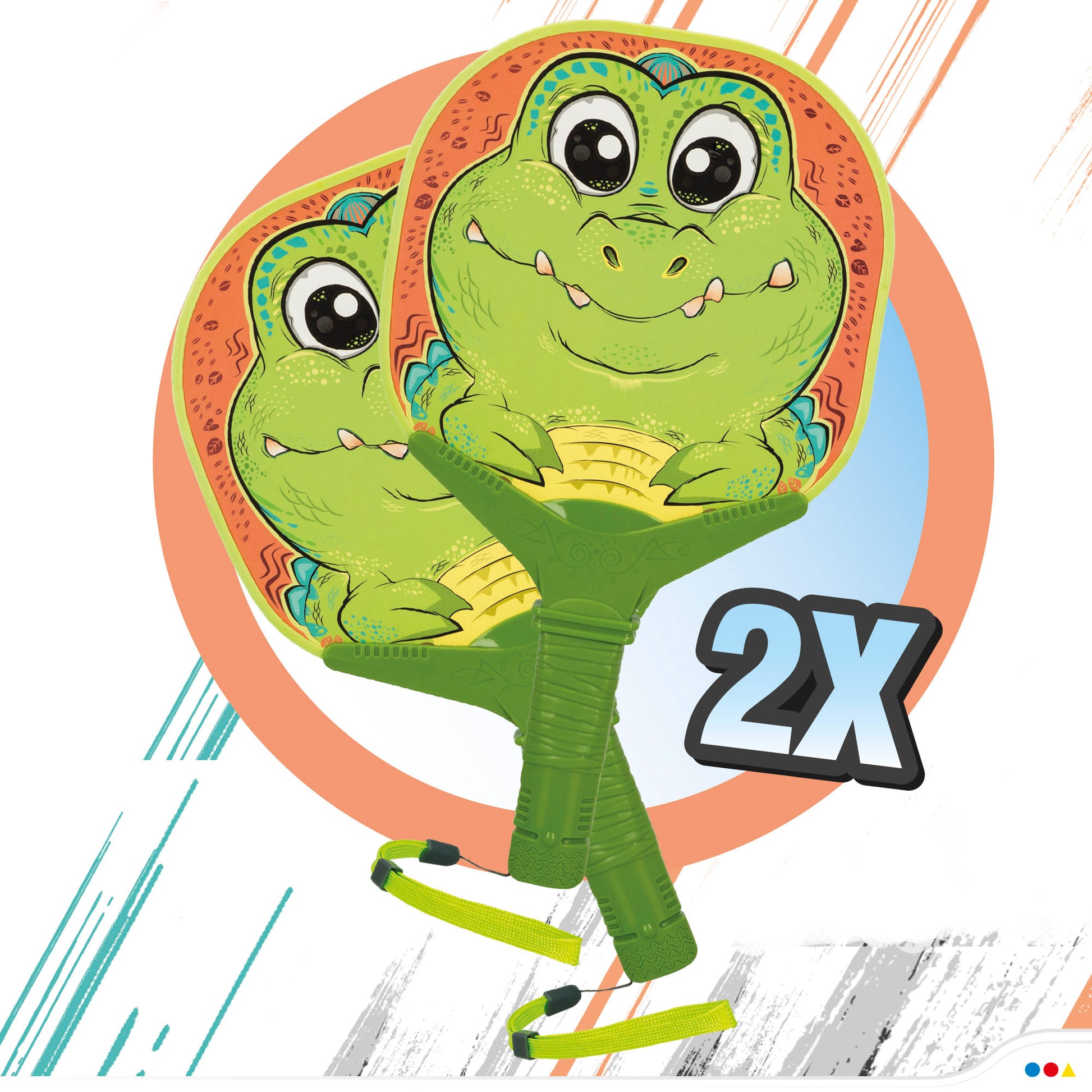 ¡Improvisa una partida de palas en la playa con este set de raquetas de CB Sports! Cada pala tiene un diseño infantil y divertido de un simpático cocodrilo en el cuerpo. Están fabricadas de plástico y para mayor seguridad y comodidad durante el juego llevan un asa de muñeca regulable incorporada. El set incluye dos palas y dos volantes con plumas. La raqueta mide 18,5 cm de ancho x 33 cm de alto y el volante 7 cm de ancho x 10,5 cm de alto. Recomendado a partir de 3 años.