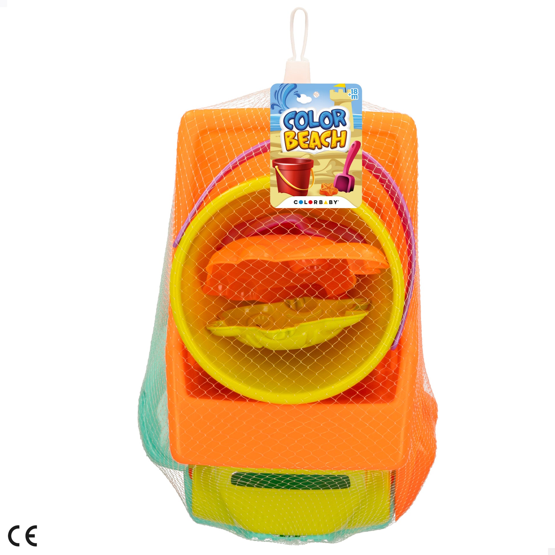 El set contiene 7 piezas: 1 camión de arena, 1 cubo, 1 pala, 1 rastrillo y 3 moldes marinos con divertidas formas (estrella de mar, cangrejo y barco). Todo viene presentado en una bolsa de rejilla para un transporte cómodo y práctico.