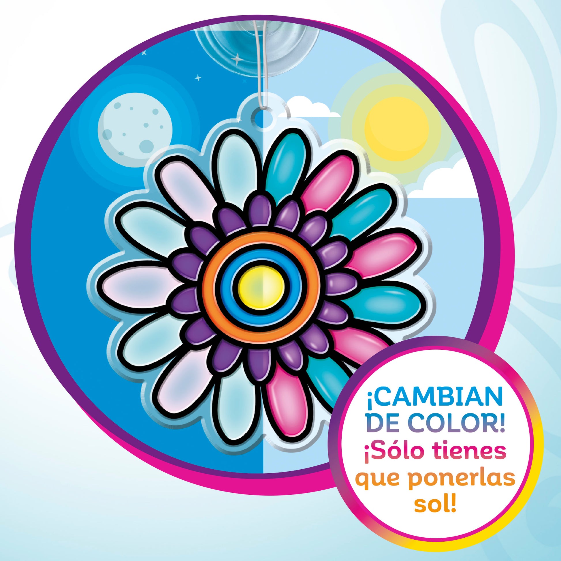 Este completo kit viene con 12 atrapasoles de plástico listos para colorear, 12 ventosas y una madeja de cordón plateado para una fácil colocación en las ventanas. Además, incluye dos hojas con plantillas de dibujos, dos hojas de calco, dos innovadoras pinturas para cristal que cambian de color y otras seis pinturas para cristal en diferentes colores. Y por supuesto, un pincel e instrucciones para que una experiencia sencilla y divertida.