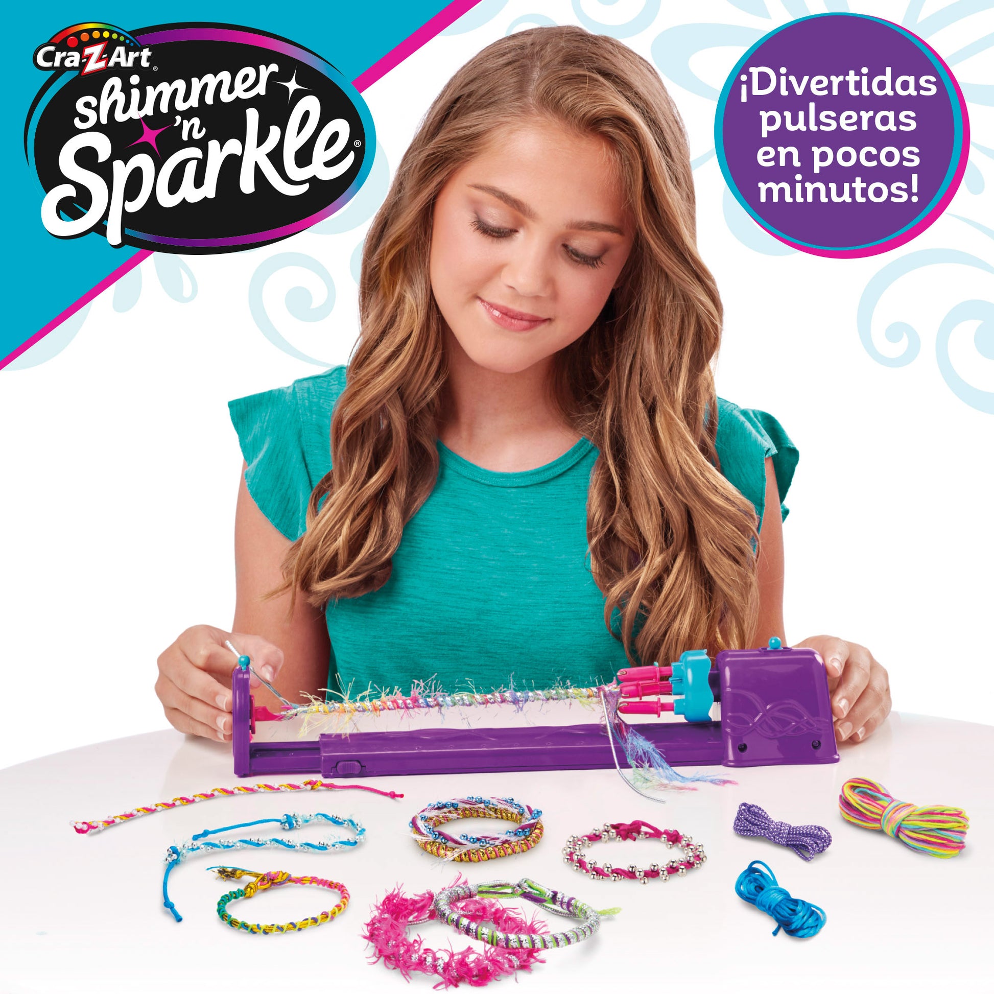 ¡Haz pulseras totalmente diferentes y especiales con el estudio de pulseras Shimmer `n Sparkle! Estudio con todo lo necesario para que vayas a la moda. Incluye la unidad Twist ` n Wear, 1 abrazadera, 6 madejas de hilos surtidos, 13 madejas de seda surtida, 7 ovillos de cordón y 3 madejas de abalorios surtidos. ¡Consigue hasta 4 estilos diferentes! El juego desarrolla la habilidad manual, la creatividad, la motricidad fina, la comprensión causa-efecto, el aprendizaje y la socialización.