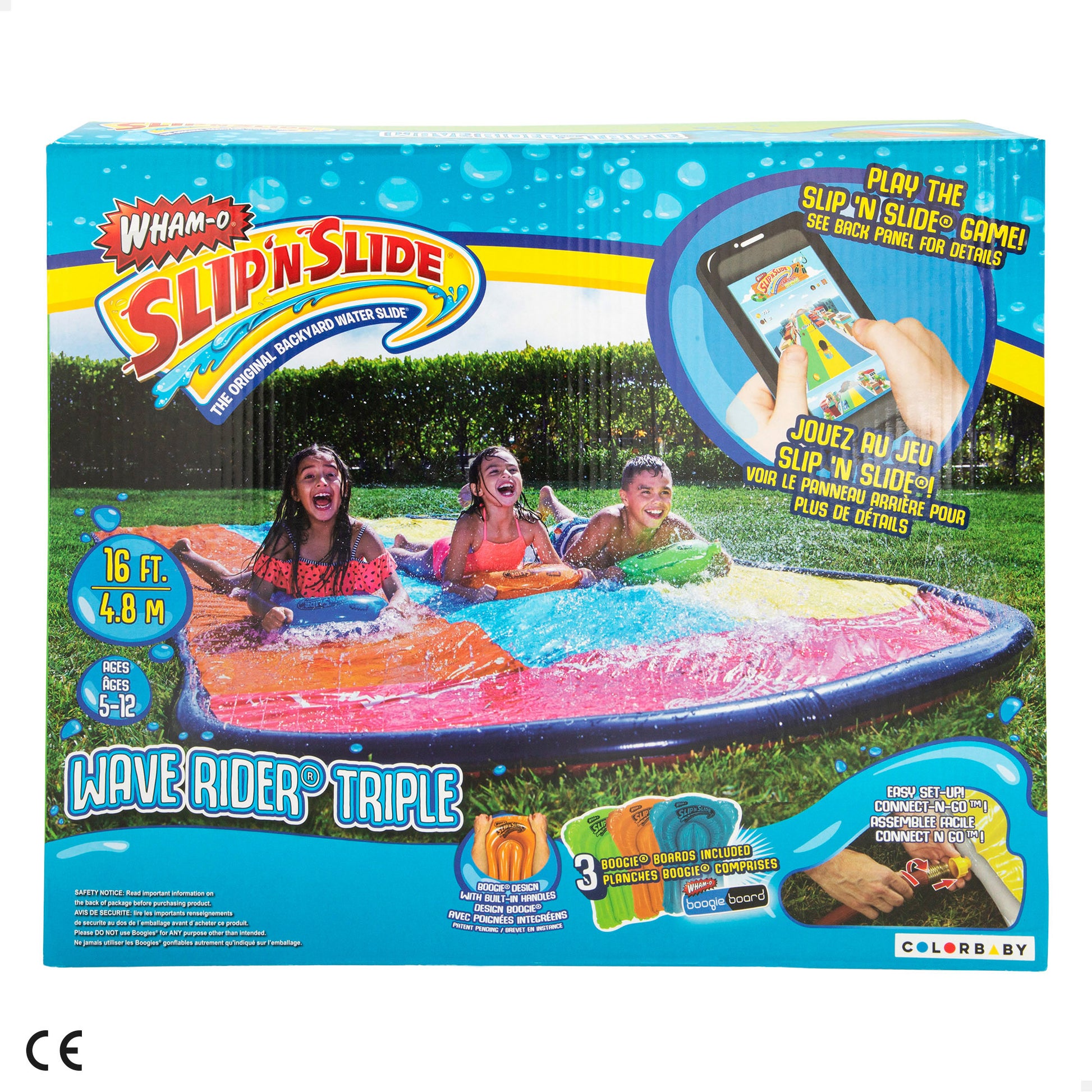 Este juguete de exterior está recomendado para niños y niñas de entre 5-12 años (bajo supervisión adulta y tras leer atentamente las precauciones de seguridad). La pista mide 4,8 metros de largo, está fabricada de PVC y es fácil de instalar. Extiende la lona sobre una superficie blanda y plana tras comprobar que no haya piedras ni ningún obstáculo que pueda hacer daño a los pequeños o romper la lona (se recomienda instalar sobre césped). Después, fija la superficie al suelo sirviéndote de las anclas incluidas y conecta la manguera a la toma de conexión rápida Connect 'N Go para que salgan chorros de agua por los orificios de la lona. Este increíble juego de agua, tiene APP propia que se puede descargar escaneando el código QR de la caja. ¡Ahora los niños también podrán jugar a deslizarse desde el móvil!