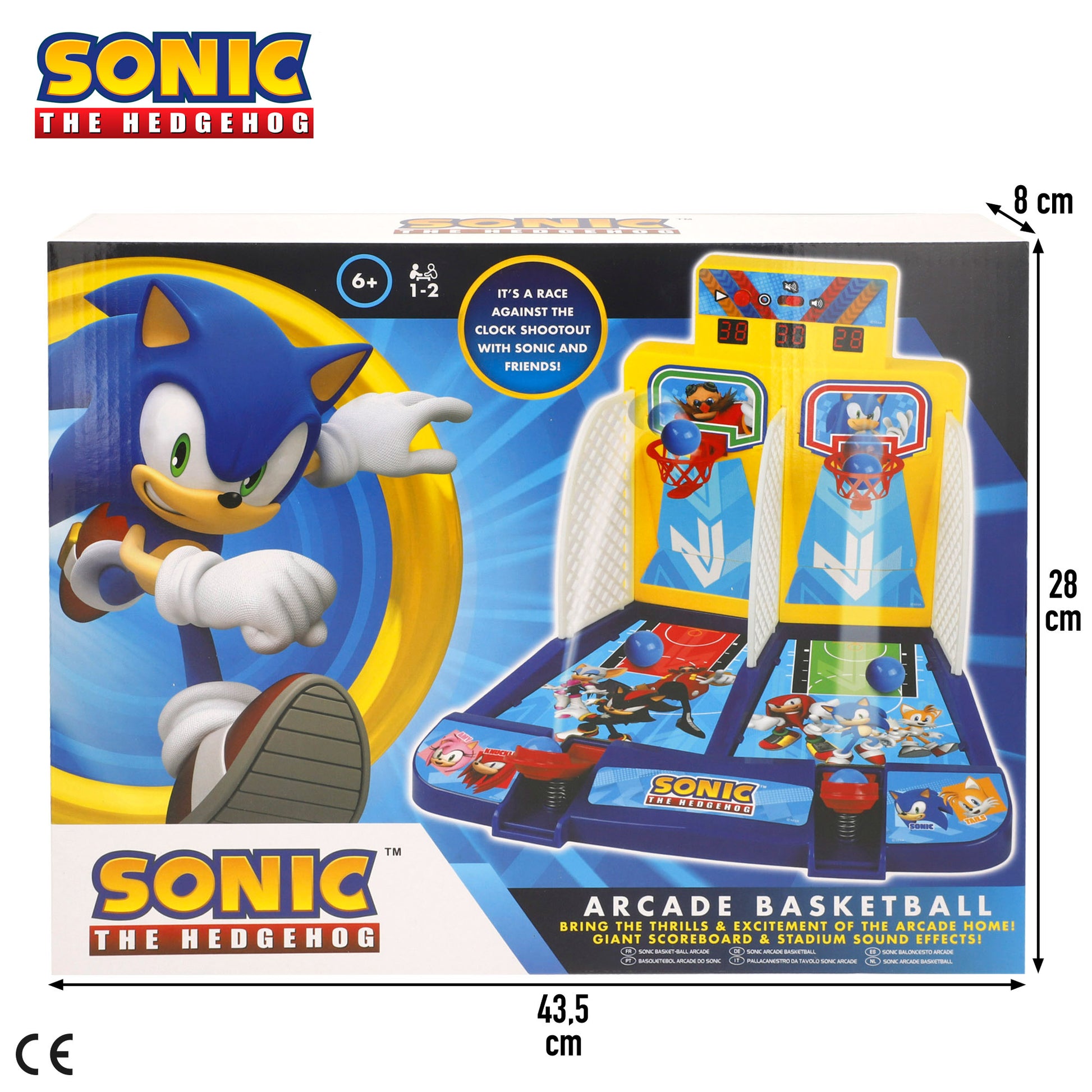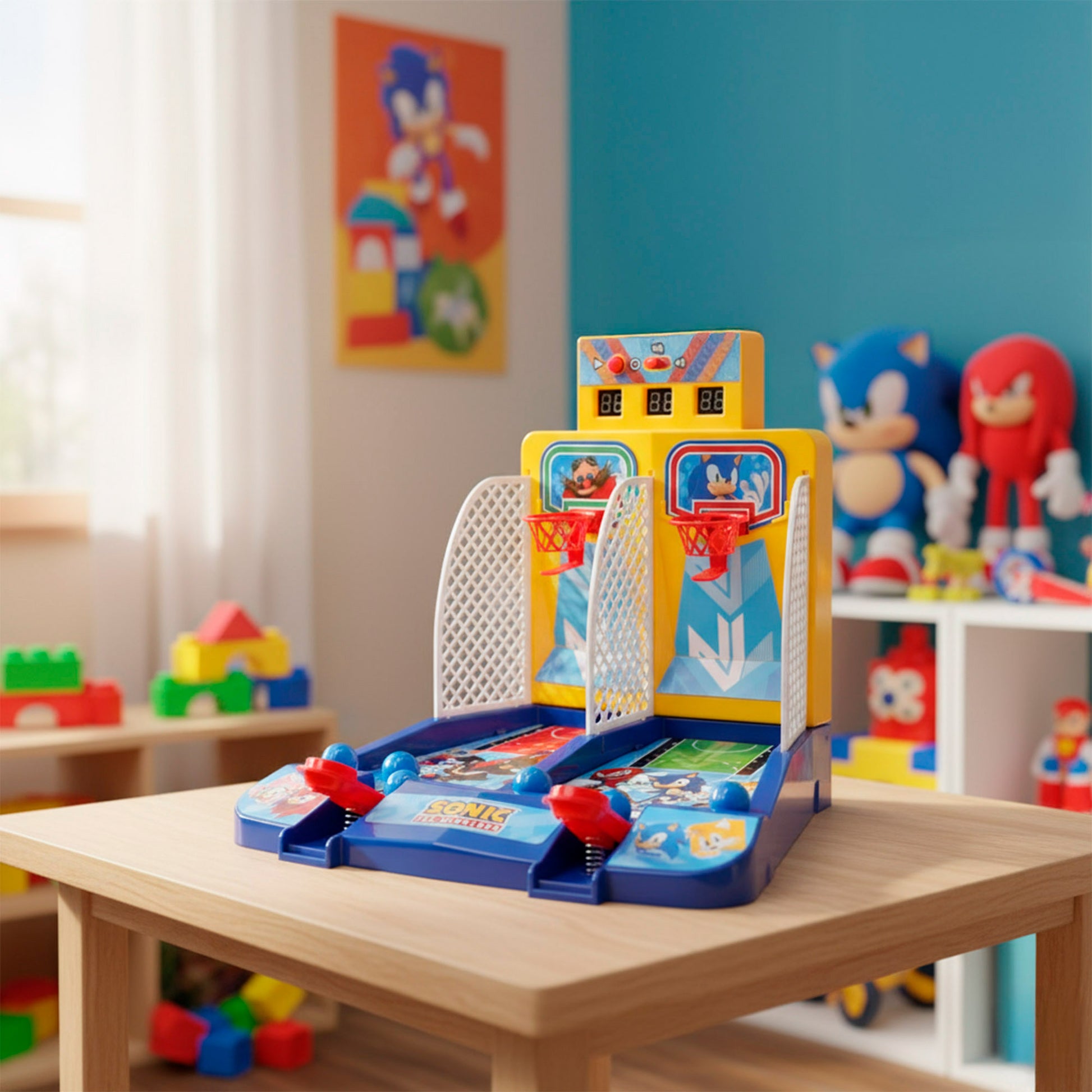 Estructura amarilla con el universo Sonic con sus icónicos amigos y villanos, 2 canastas, 2 lanzadores, 6 pelotas y marcador digital doble. Laterales de rejilla para mantener las bolas en juego y tablero inspirado en el mapa clásico.