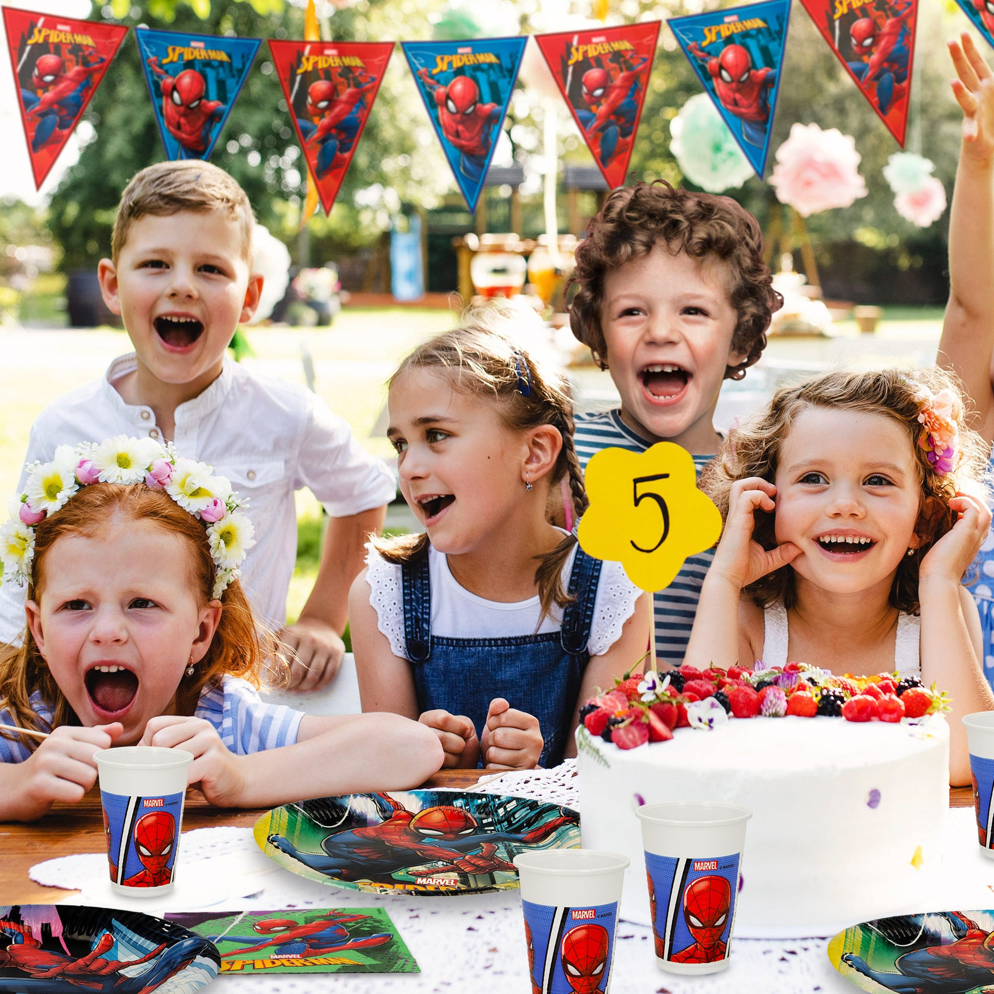 El set contiene 66 piezas entre las que se incluyen 1 mantel (120x180 cm), 8 vasos (200 ml), 8 platos grandes (Ø23 cm), 8 platos pequeños (Ø19,5 cm), 20 servilletas (16,5 cm), 1 guirnalda de banderines (2,8 m), 6 invitaciones con sobres (12x12 cm), 6 bolsas de regalo (16,5x23 cm) y 8 globos decorativos (28 cm aprox.). Todo decorado con los personajes y llamativos colores de Spider-Man.