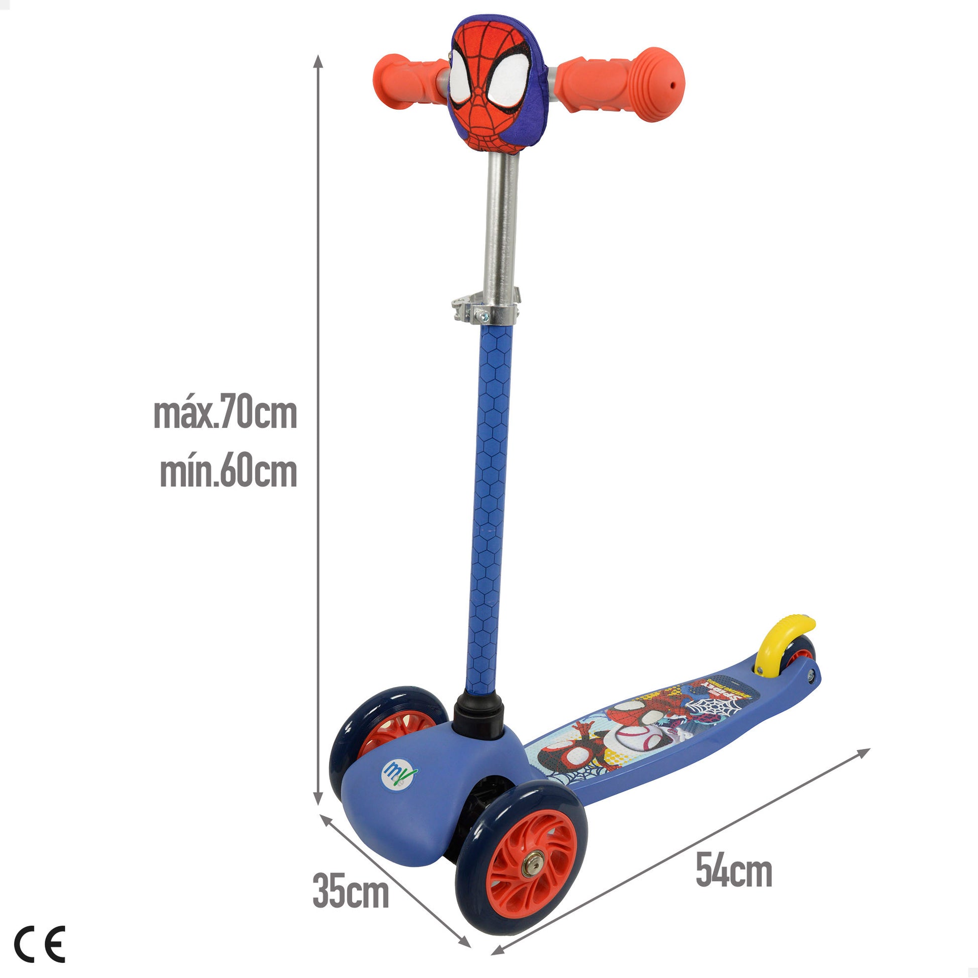 Este patinete de tres ruedas incorpora un manillar ajustable en altura con puños ergonómicos, una bolsa delantera decorada con Spidey para llevar pequeños objetos, base antideslizante y tres ruedas que facilitan una conducción estable y segura.