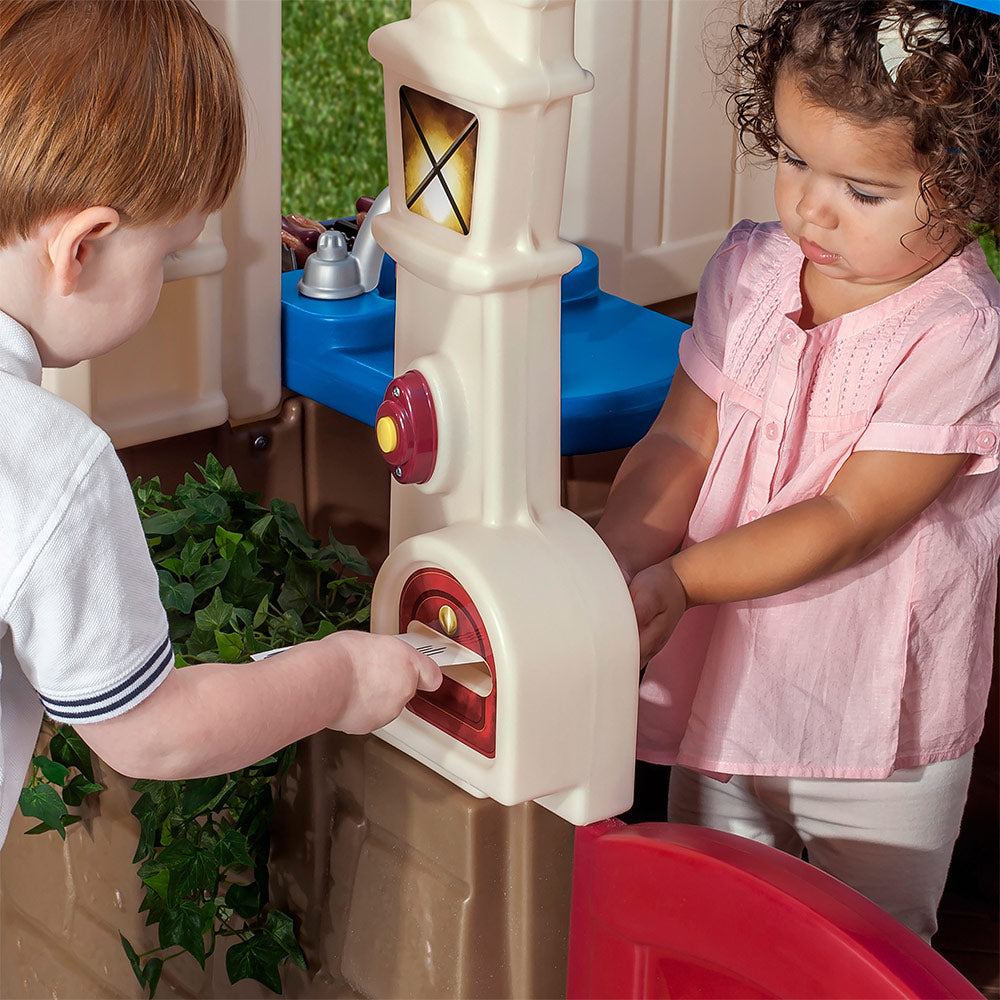 ¡Diversión en la casita Step2! Incluye un móvil para invitar a los vecinos y un timbre eléctrico para recibir la visita. Con suelo, puerta y ventana que se abre y cierra, fregadero, barbacoa, buzón y asiento. Mide 118x130x89 cm (alturamáxima 1,14 m). Funciona con 2 pilas tipo AAA y es para mayores de 18 meses. Requiere montaje por un adulto y desarrolla la habilidad manual y la imaginación.
