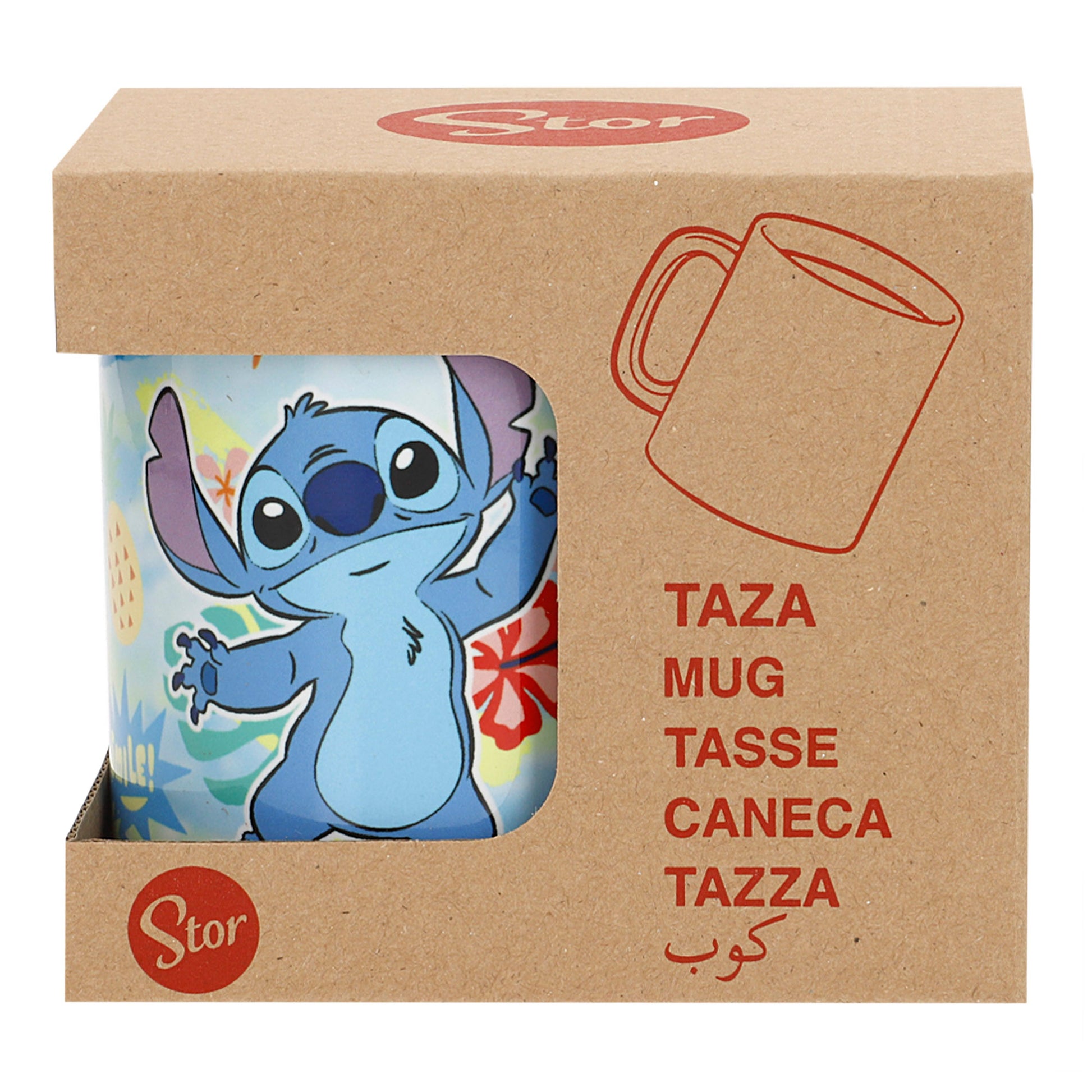 Incluye una taza de cerámica de alta calidad con asa ergonómica. Está decorada con ilustraciones del fantástico Stitch y viene en una caja de cartón con ventana, perfecta para regalo o colección.