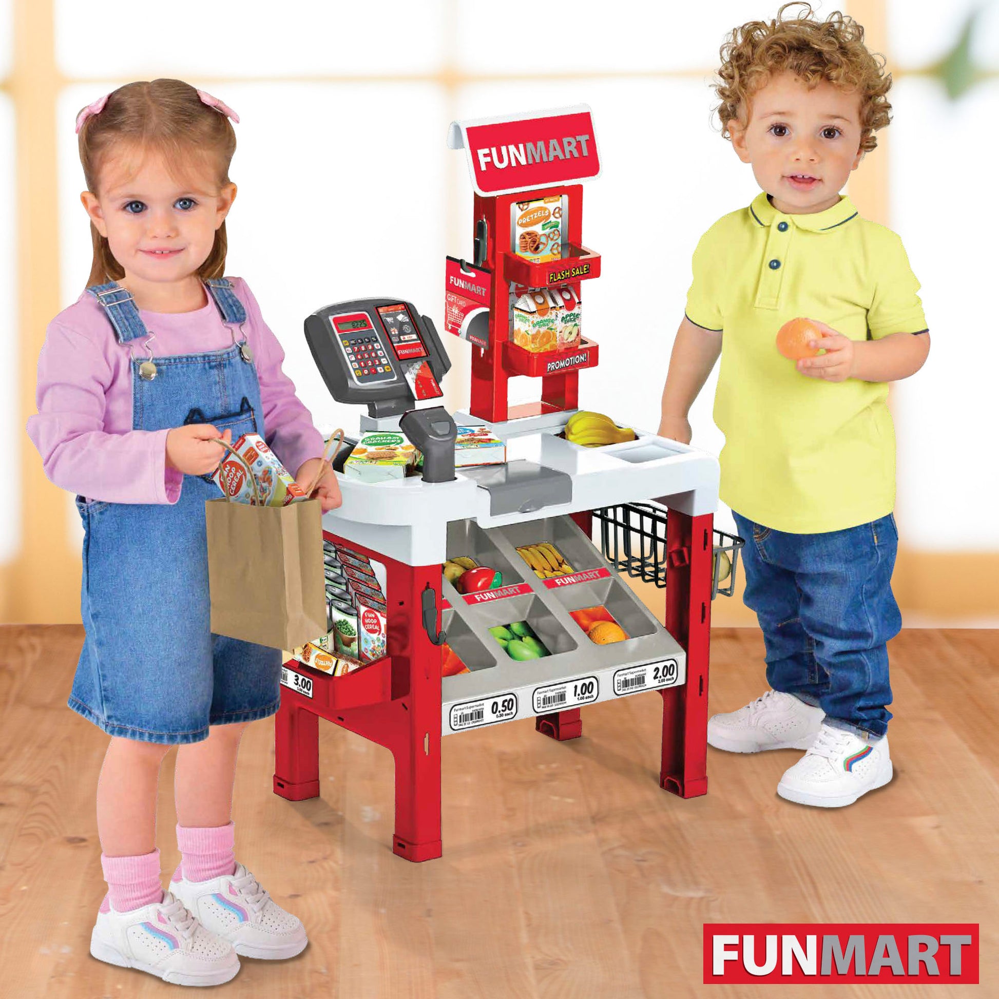 ¡Gestiona tu propio puesto de mercado! En este supermercado de juguete puedes exponer los productos más vendidos en los estantes superiores, las frutas y verduras en el expositor de autoservicio o servir croissants recién hechos en el mostrador. La tienda cuenta con una caja registradora moderna con calculadora real, lector de tarjeta de crédito y cajón de monedas manual. Además, ¡podrás leer los códigos de barras con el escáner como en una tienda de verdad!