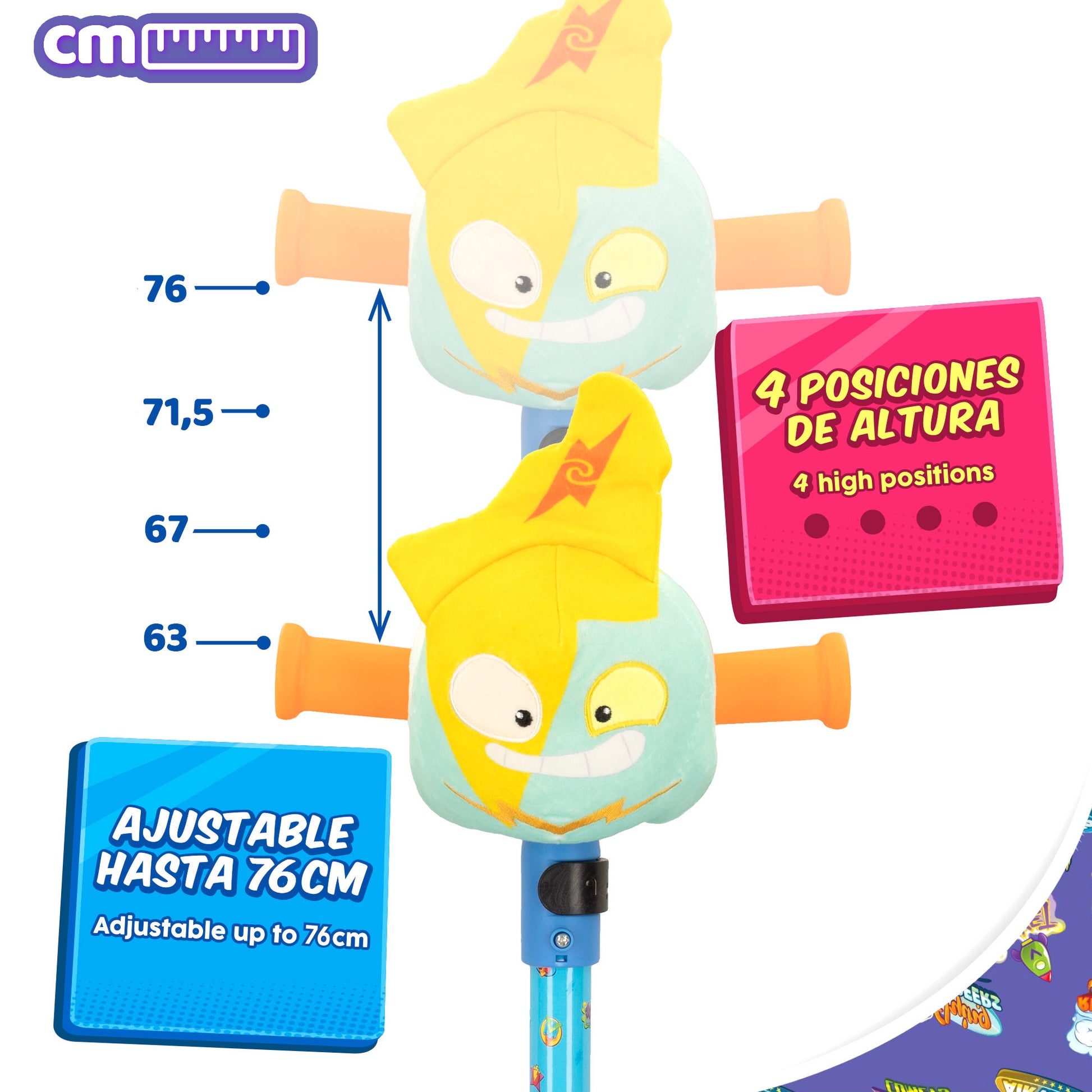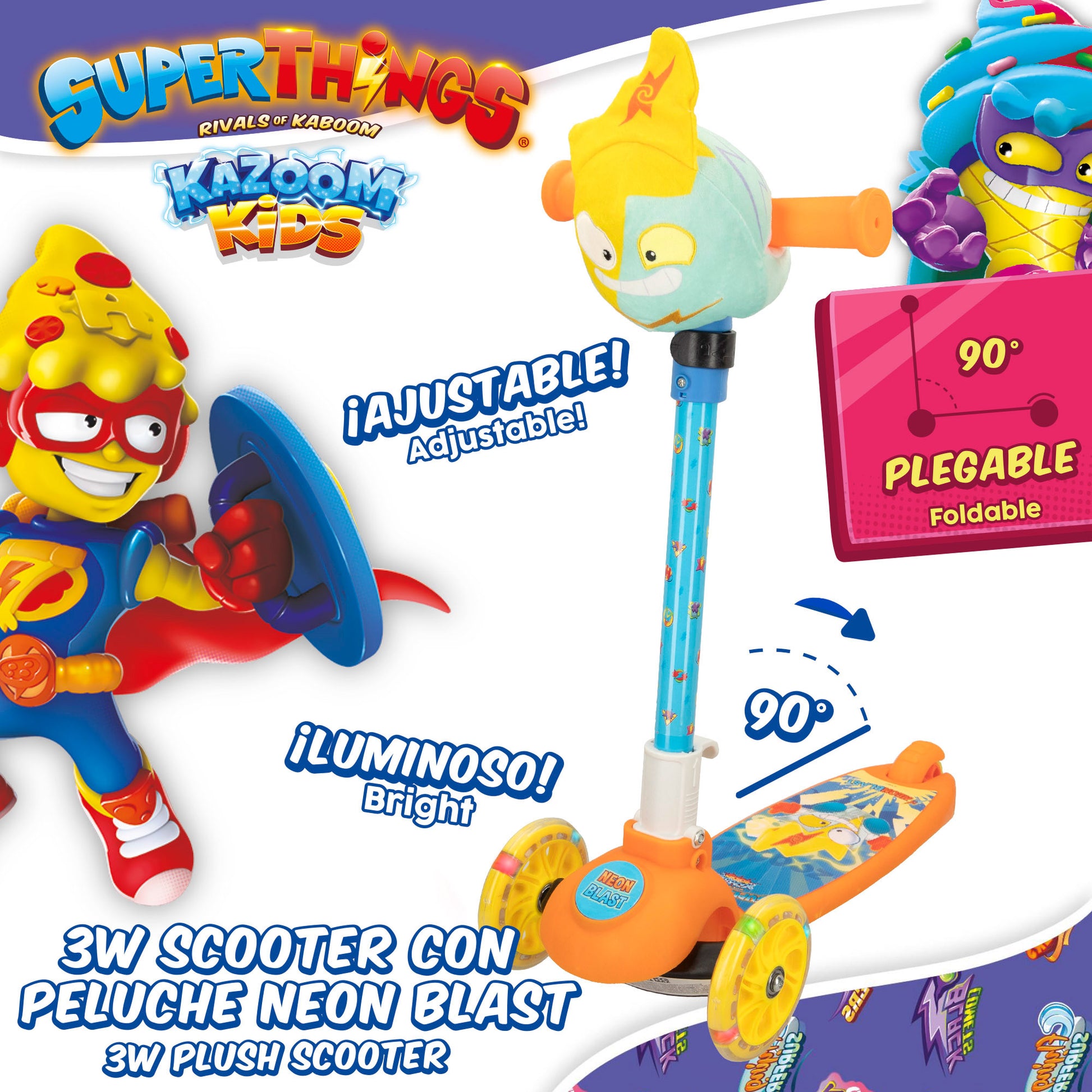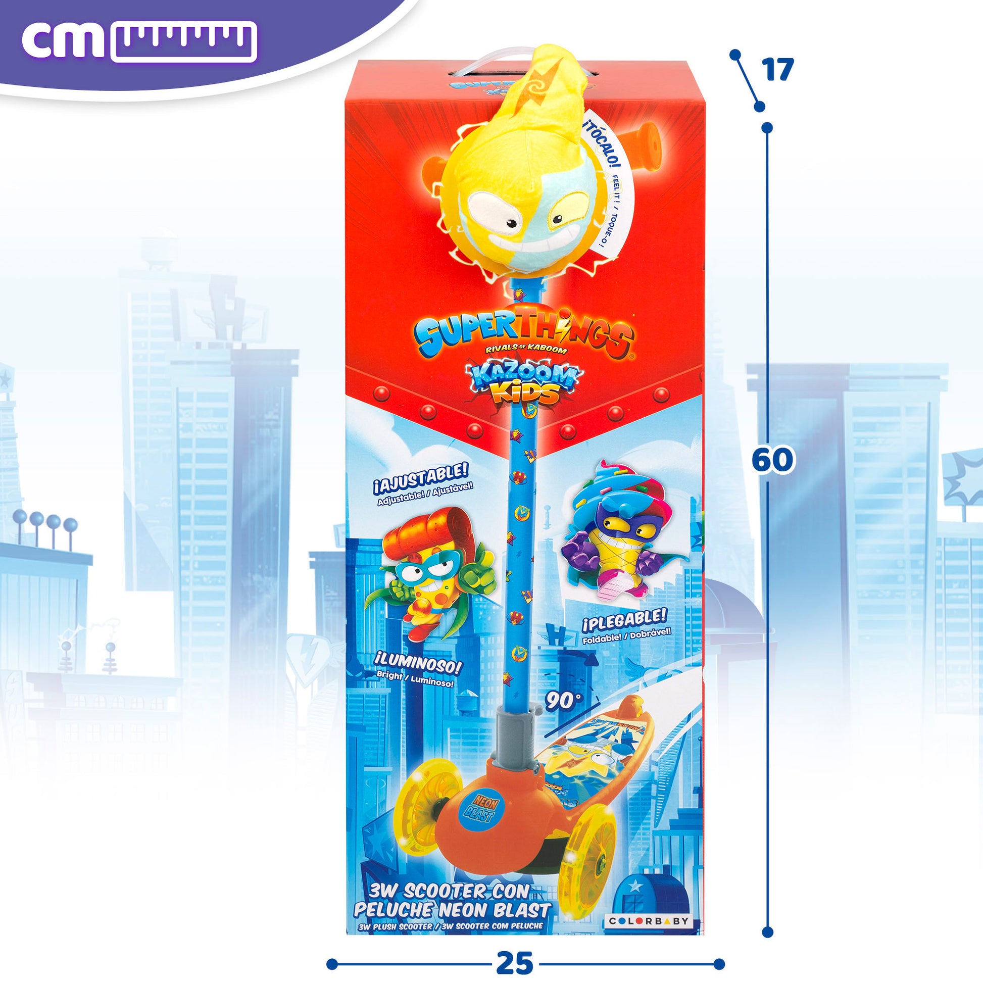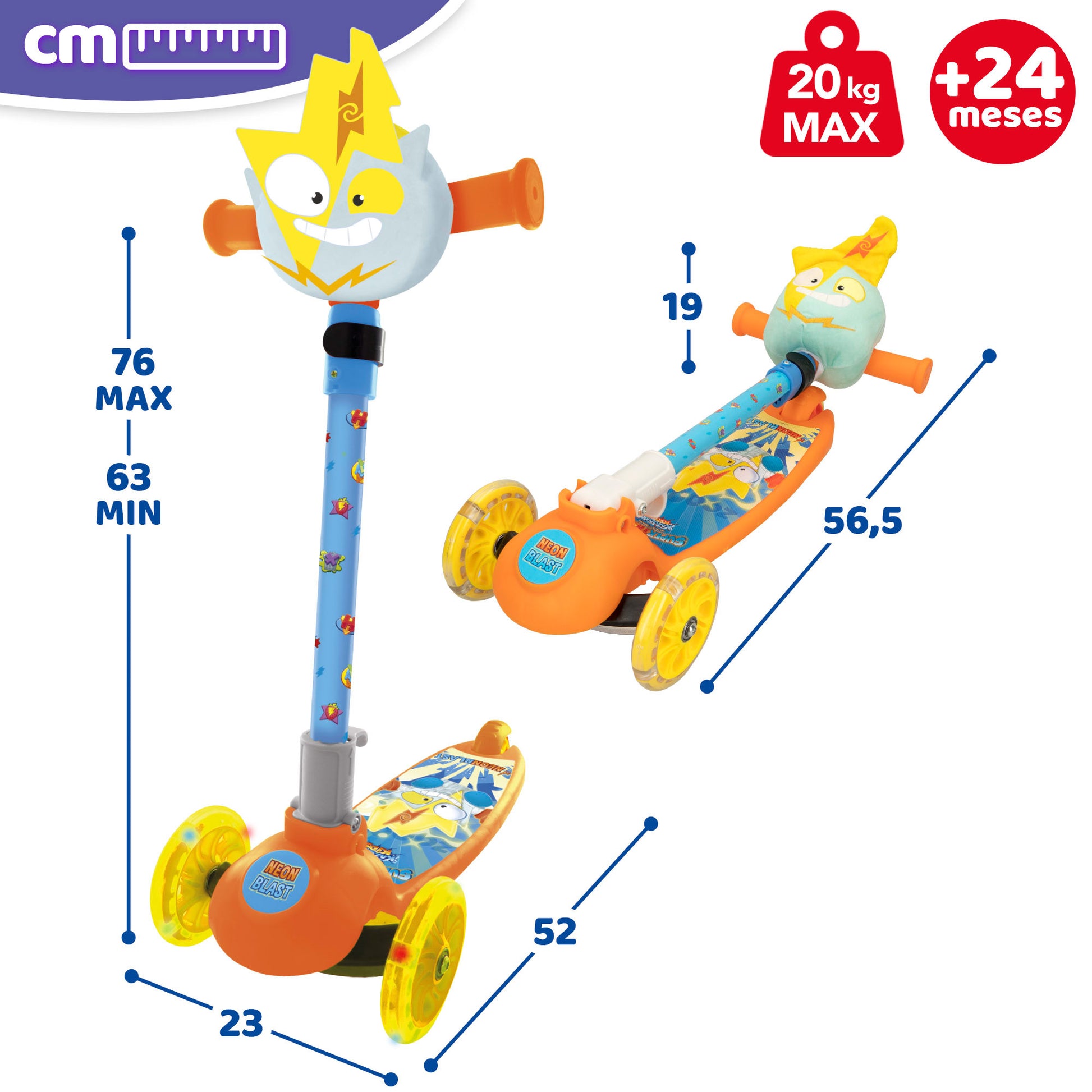 Patinete multicolor con cabeza de Neon Blast SuperThings de peluche (extraíble) y luces en las ruedas. El patinete mide 52x23x67-76 cm y su manillar cuenta con altura regulable en 5 posiciones y se pliega 90º para poder transportarlo cómodamente. Los peques estarán seguros y estables en los giros gracias a su amortiguación a cada lado. Soporta un peso máx de 20 kg y está recomendado para niños a partir de 2 años.
