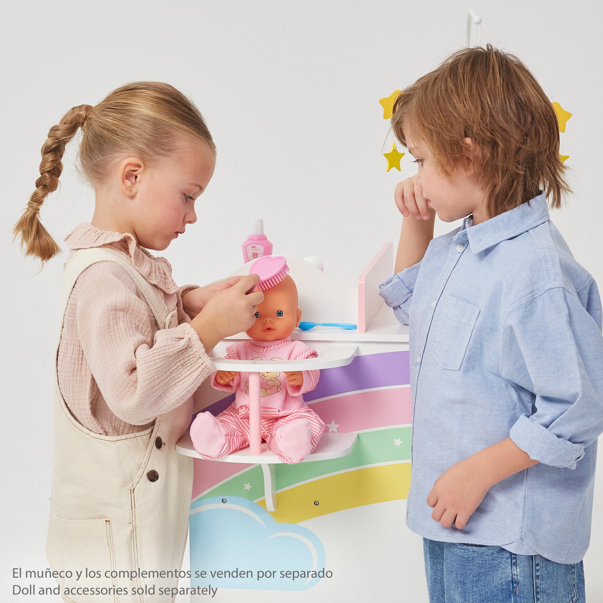 ¡Baña, cambia y dale de comer a tu bebé en este precioso cambiador de madera 3 en 1 Teamson! El cambiador cuenta con un diseño de arcoíris, estrellitas y nubes en colores suaves y agradables que calmarán inmediatamente a tu bebé. Con este cambiador de juguete no tendrás que desplazar a tu bebé por toda la casa para bañarlo, cambiarlo o darle de comer. Ahora podrás hacerlo todo en el mismo lugar y casi sin moverte. ¡Es el juguete ideal!
