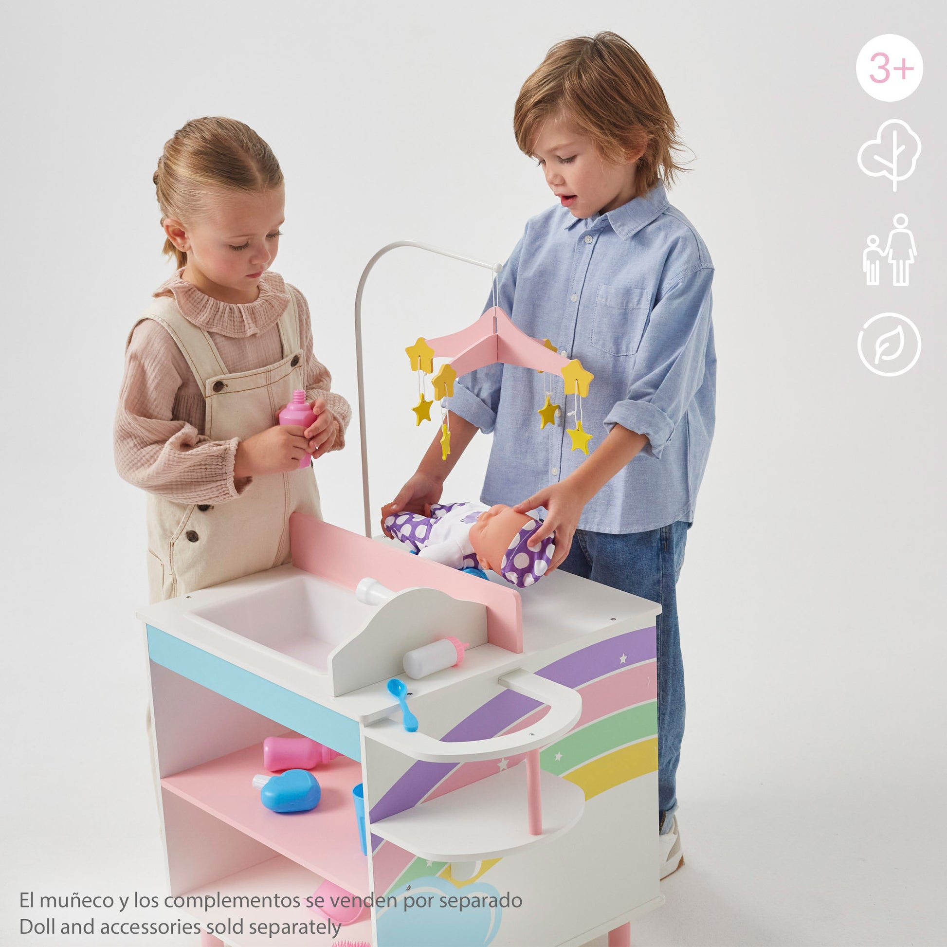 Este cambiador de madera va equipado con carrusel de estrellitas para que tu bebé se calme y relaje al instante y un armario con accesorios de muñecas como 3 perchas de madera para colgar la ropita del bebé y tenerla a mano cuando lo estés cambiando. Cuenta también con una zona de bañera con grifo extraíble para darle sus primeros baños y 2 estanterías para dejar los accesorios de baño o las toallas que vayas a necesitar. Y, por si fuera poco, también incorpora una trona situada en un lateral para que puedas sentar al bebé y darle de comer o dejarlo sentado de forma segura mientras preparas su ropita para cambiarle.