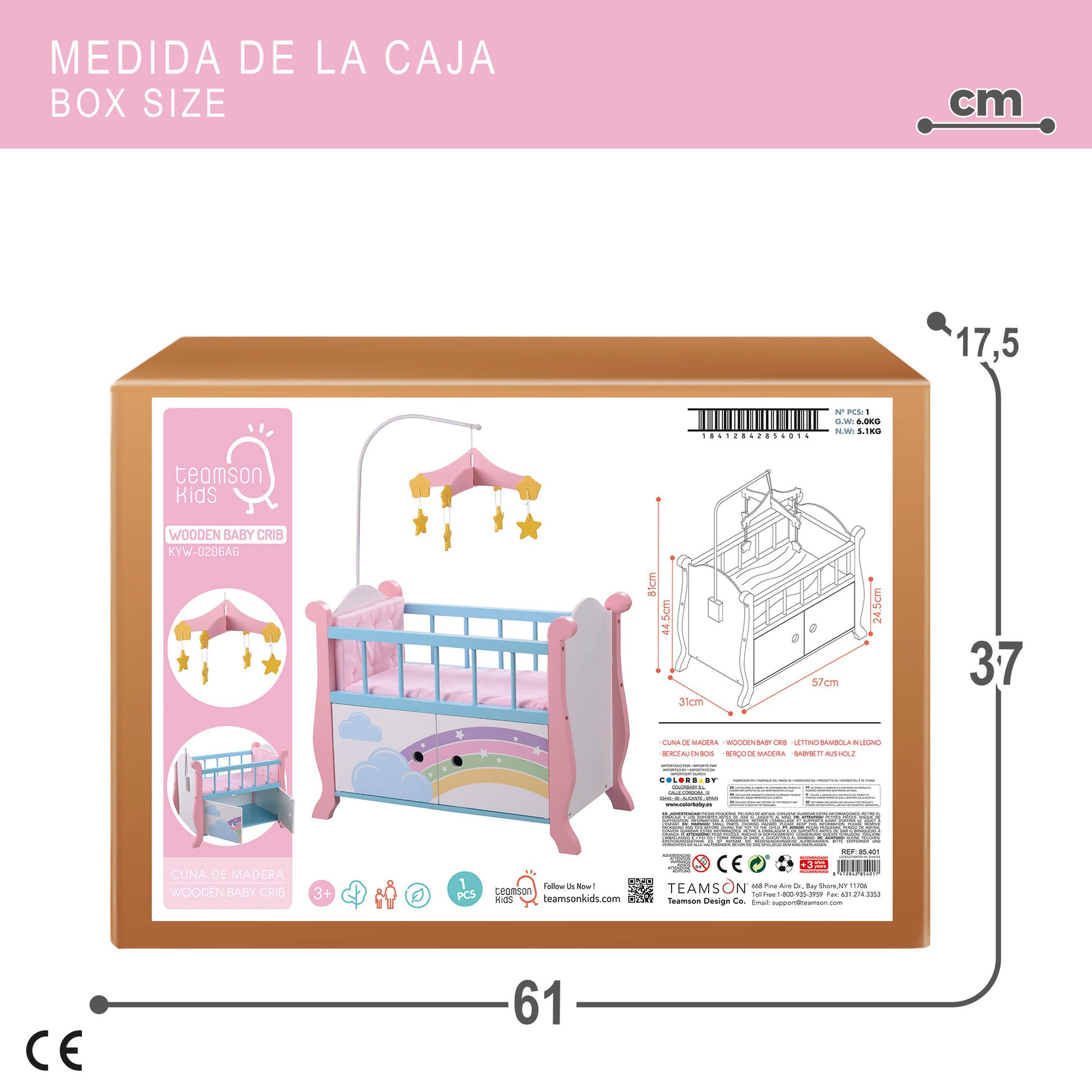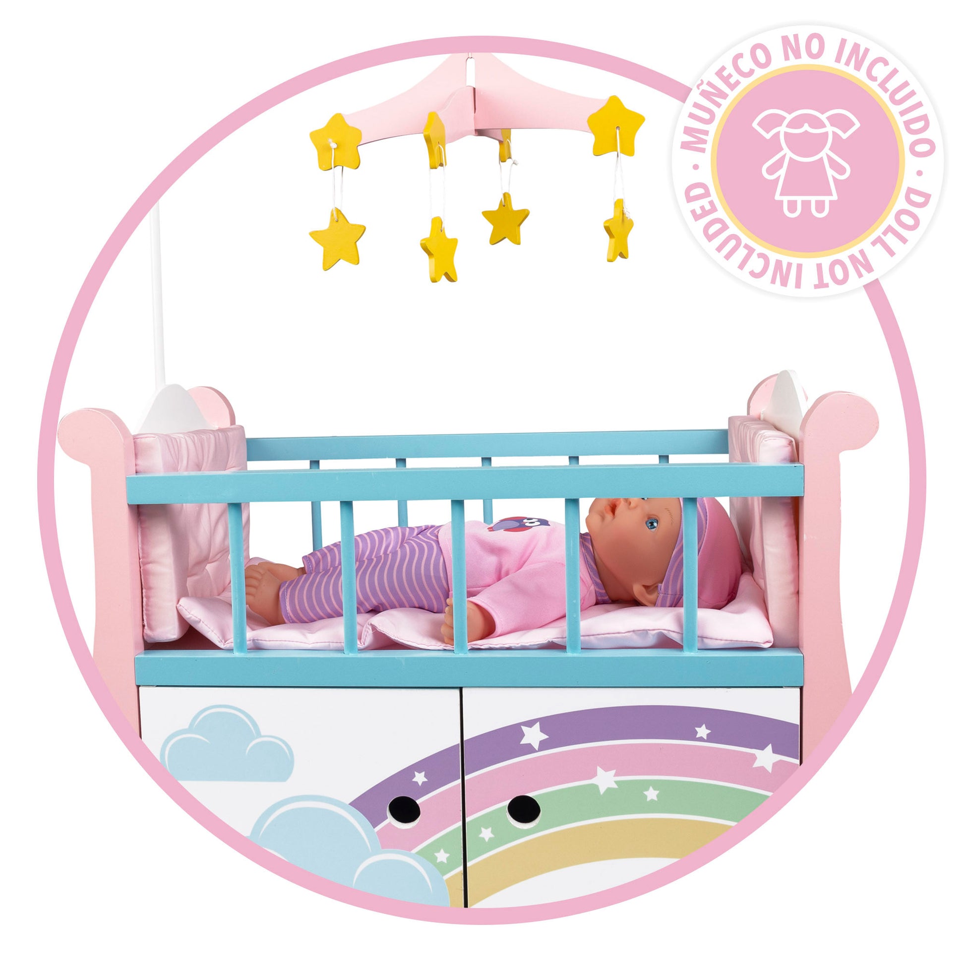 Con la cuna de madera para muñecos de Teamson Kids, los más pequeños se divertirán jugando a papás y mamás mientras hacen que sus bebés duerman plácidamente en esta cunita de ensueño. Diseñada en colores suaves y agradables, incluye 1 carrusel de estrellitas, 2 cabeceros acolchados de quita y pon con velcro, 1 colcha blandita extraíble, 2 barandillas protectoras y 1 armario para guardar ropita o juguetes. Se trata de un juguete simbólico que facilita la reproducción de roles adultos, ayuda a desarrollar la imaginación y favorece la afectividad y la expresión verbal. Requiere de un montaje sencillo por parte de un adulto y está recomendada para niños y niñas mayores de 3 años. Perfecta para muñecos de hasta 42 cm.
