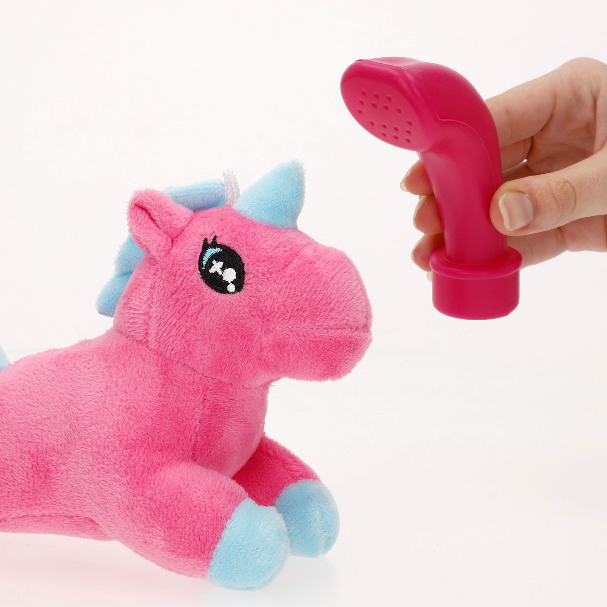Este juguete incluye un unicornio de peluche extra suave y accesorios como una botella de gel, una manguera de ducha, un secador y un espejo en forma de corazón para hacer de cada momento de juego una experiencia única y divertida. El set cuenta con un transportín con apertura frontal para meter y sacar al unicornio de peluche fácilmente y un asa para que lo puedas transportar cómodamente a cualquier lugar. Además, la puerta del transportín tiene un agujero con forma de corazón por donde asomará la cabecita para saludarte y dejará que lo acaricies.