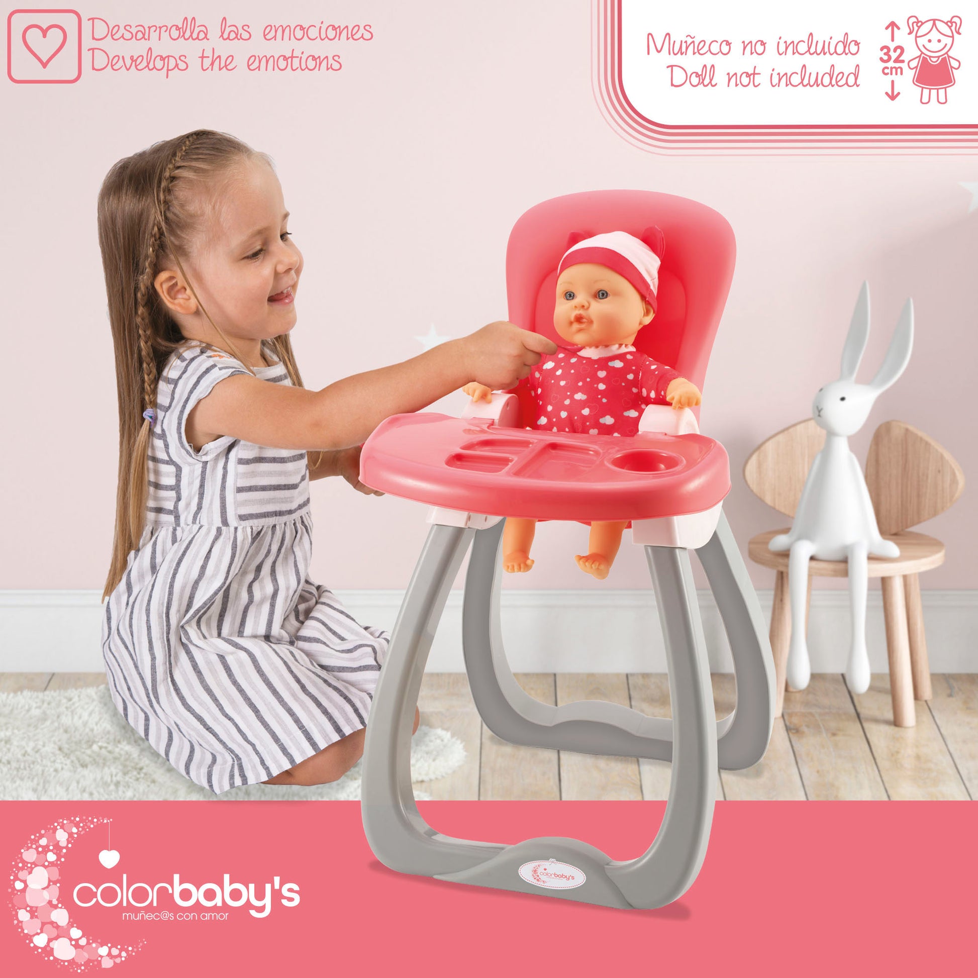 ¡Es la hora de la merienda! Dale la comidita a tu muñeco bebé en esta trona de CB Toys. Es muy cómoda para muñecos de 32 cm y tiene una bandeja frontal con huecos para colocar los accesorios. Incluye 1 biberón, 1 plato y 1 cuchara. La trona mide 30x34x54 cm. Juego simbólico que favorece la imitación de roles adultos, la imaginación, el lenguaje y la afectividad. A partir de 3 años.