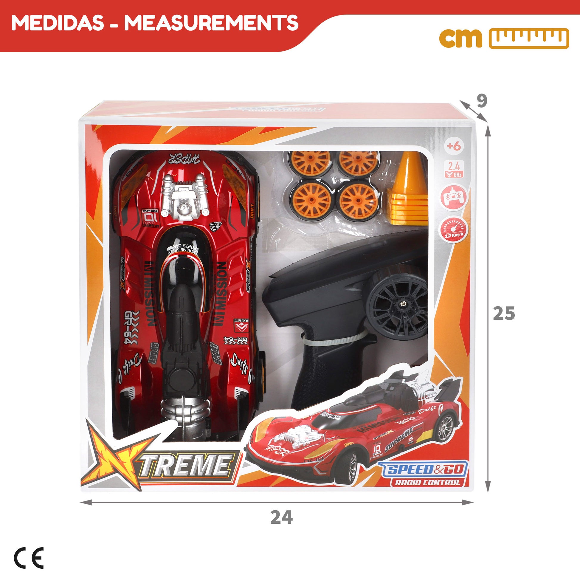 Este set completo viene con un coche teledirigido Xtreme, un mando de control tipo pistola, 4 ruedas extra para intercambiar y 6 conos de obstáculos. ¡Todo lo necesario para montar tu propio circuito de desafíos y practicar giros, frenadas y derrapes!