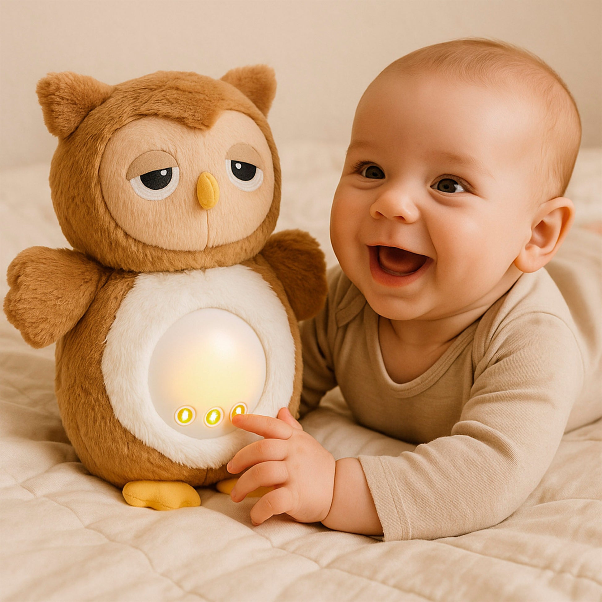 Este adorable peluche de búho incluye una barriguita luminosa con luces de colores cálidos y suaves, y más de 17 sonidos relajantes de la naturaleza y dulces canciones de cuna, con una duración de hasta 30 minutos, perfectos para crear un ambiente que favorezca el descanso y la conciliación del sueño. Dispone de control de volumen, temporizador y 3 botones independientes: uno para cambiar los sonidos de la naturaleza, otro para alternar las canciones de cuna y un tercero para modificar el color de la luz.