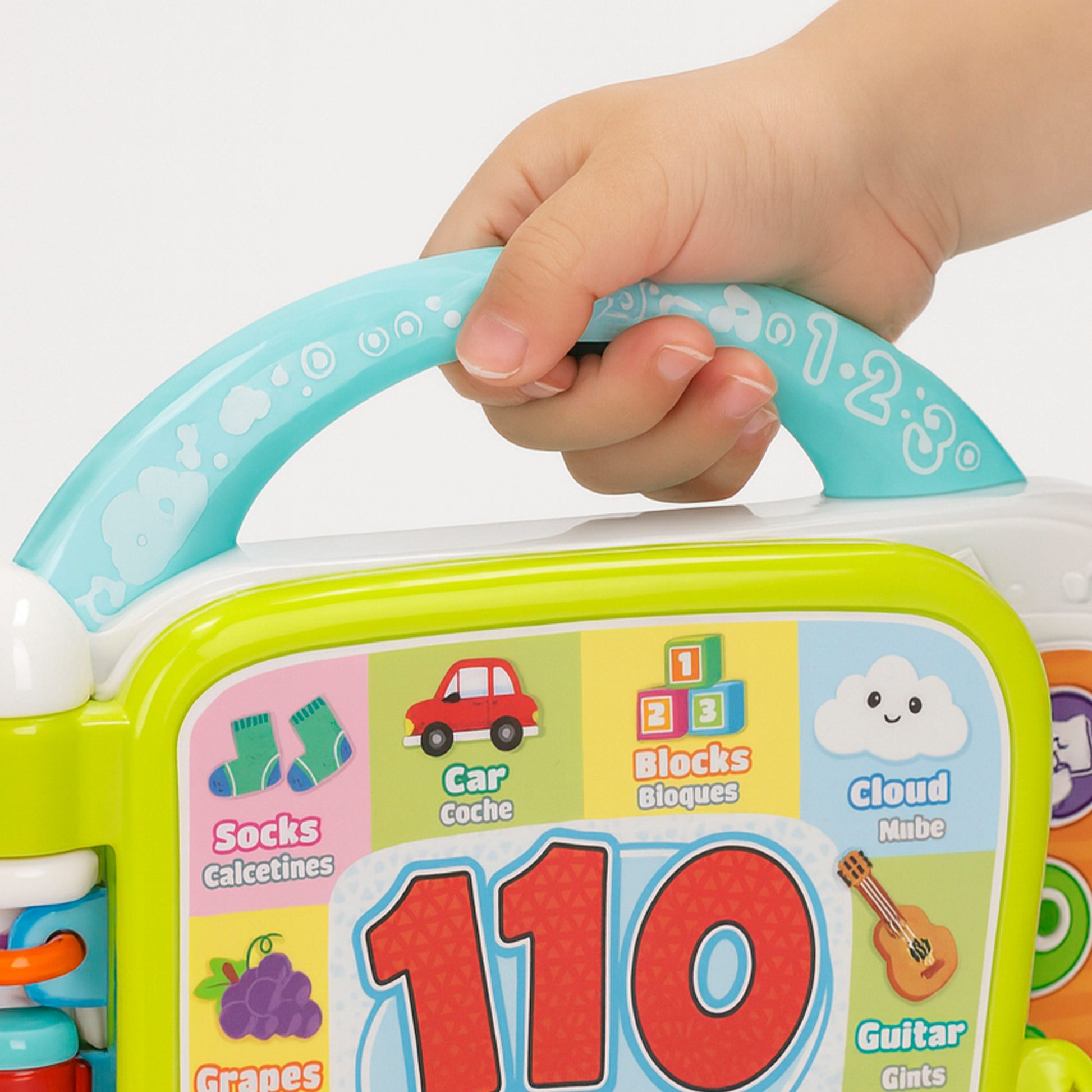 El libro bilingüe interactivo Winfun está diseñado para que los más pequeños descubran sus primeras palabras en español e inglés de forma divertida y natural. Sus páginas están llenas de ilustraciones coloridas, sonidos y melodías que convierten cada momento de juego en una experiencia de aprendizaje divertida. Gracias a su asa de transporte, podrán llevarlo a cualquier parte y seguir aprendiendo mientras juegan, exploran y se divierten descubriendo el mundo que les rodea. ¡Abre sus páginas y empieza la aventura!