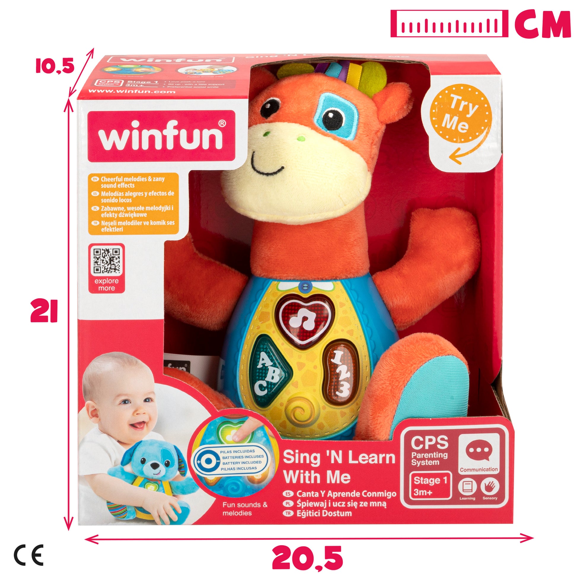 Peluche luz y sonido de WinFun. Juguete eléctrico interactivo. Su cabeza y extremidades son de material blando (poliéster) y su cuerpo es de material duro (plástico). En la barriga tiene tres botones de luz: en forma de estrella, ABC y 123. Al apretarlos suenan melodías, rimas, frases divertidas u otros efectos. Funciona con 2 pilas AA incluidas. Edad recomendada a partir de 3 meses. Con forma de jirafa en color rojo.