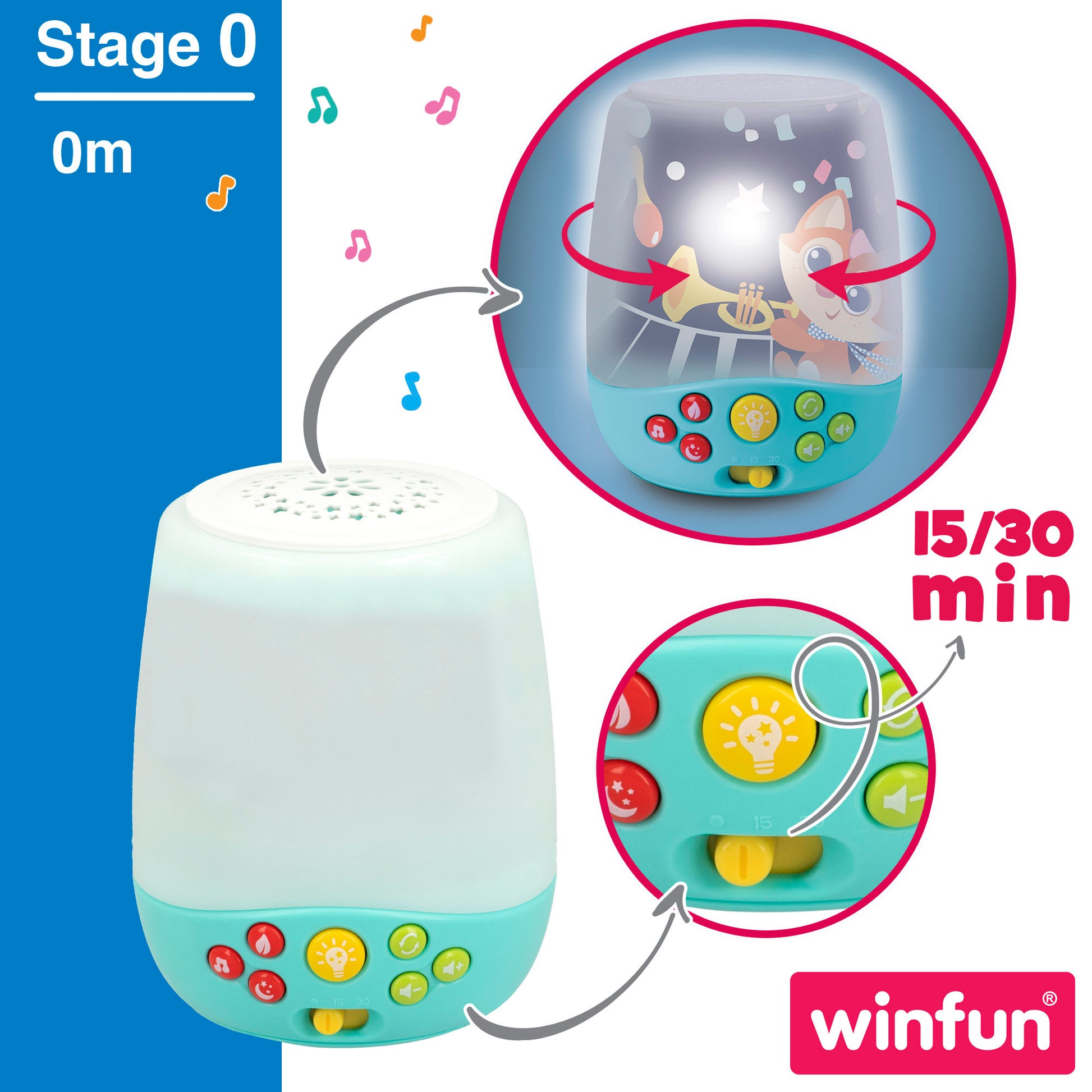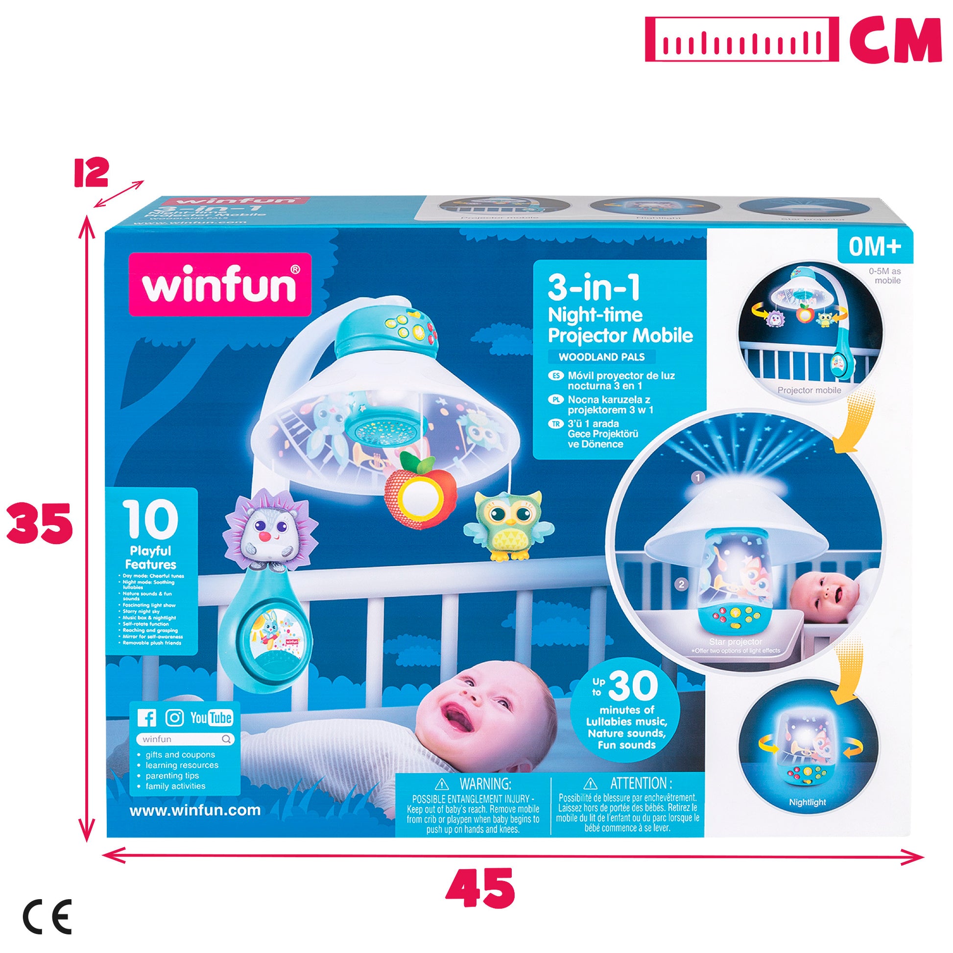 Proyector para bebé Winfun con 3 modos: proyector móvil, luz de noche y proyector de estrellas. El proyector móvil cuenta con 30 minutos de música continua y tres peluches colgantes que giran sobre tu bebé. Incorpora modo diurno con melodías alegres y modo nocturno con música de cuna y de naturaleza. Con botón para ajustar el volumen. Diseñado en colores vivos. Se recomienda para bebés a partir de 0 meses.