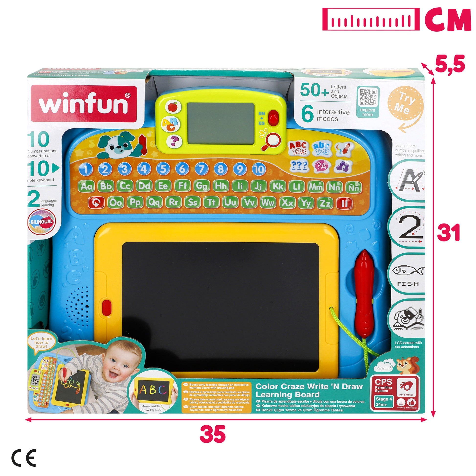 Esta tablet infantil Winfun es una herramienta perfecta para que los niños y niñas jueguen y aprendan en dos idiomas: español e inglés. Con un diseño portátil, pantalla LCD animada y un panel de dibujo extraíble, los peques podrán explorar letras, números y juegos mientras escriben con el lápiz, que siempre podrán guardar en la ranura posterior del panel. ¡Con botones interactivos y teclado de colores para un juego de lo más divertido!