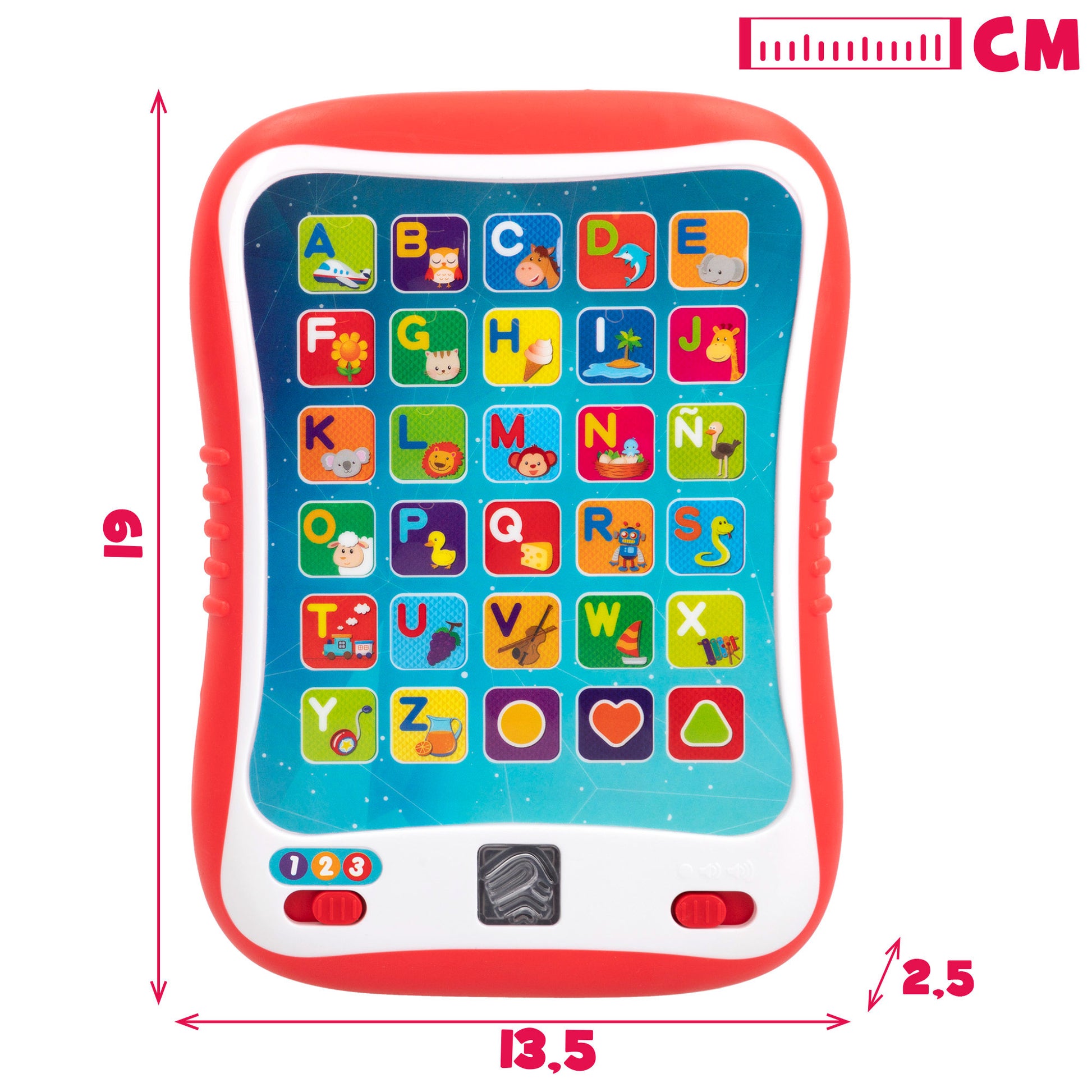 La tablet educativa cuenta con 30 botones táctiles que, dependiendo del modo de aprendizaje seleccionado, emiten diferentes sonidos o melodías. Si seleccionas el modo de aprendizaje 1, se activa la lección de aprendizaje, lo que hará que cuando pulses las teclas, escuches el sonido de la letra y palabras asociadas a esta. Seleccionando el modo de aprendizaje 2, se activa la lección de vocabulario. Esta lección te enseñará objetos o formas y cómo deletrearlos. Por último, el modo de aprendizaje 3 te permitirá escuchar los sonidos que emiten o representan los elementos o animales que aparecen en la tecla sobre la que has pulsado.