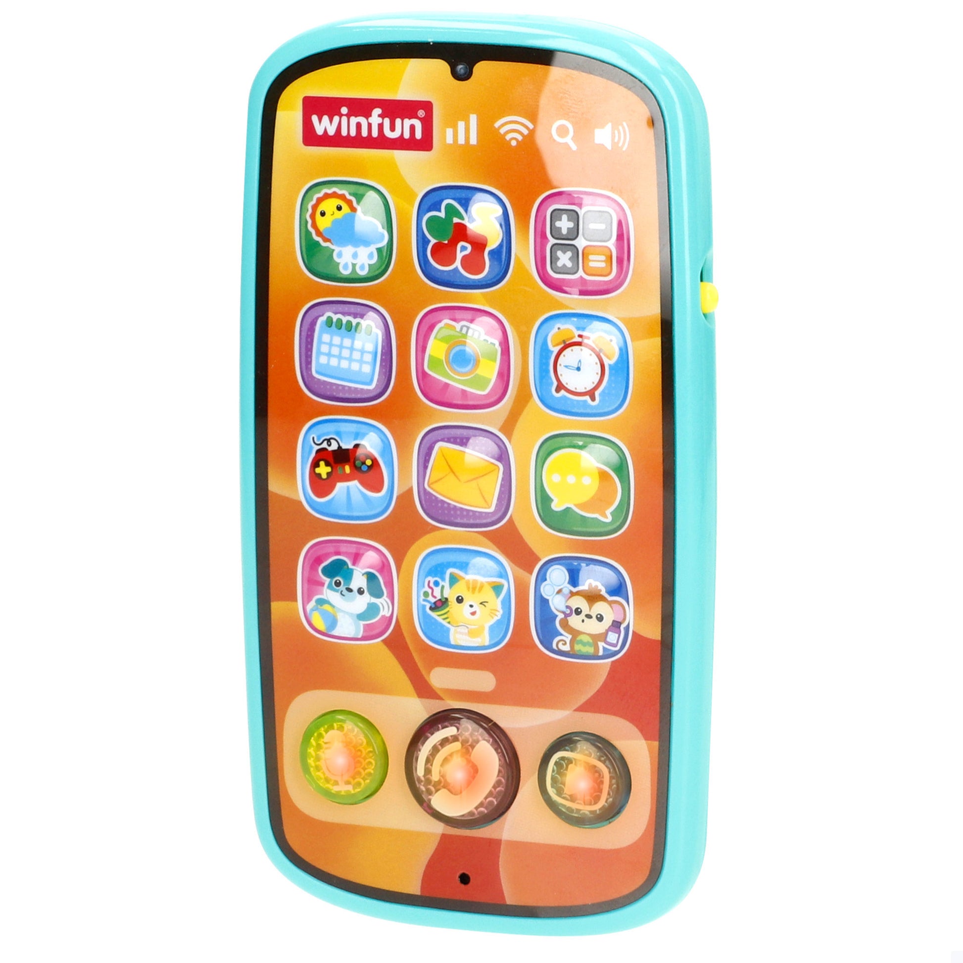 ¡Pulsa los botones de este móvil interactivo Winfun y pásatelo en grande mientras suenan las divertidas melodías! El móvil tiene un diseño colorido y alegre, con borde ergonómico para facilitar su agarre. ¡Un teléfono de juguete a medida para jugar, aprender y divertirte!