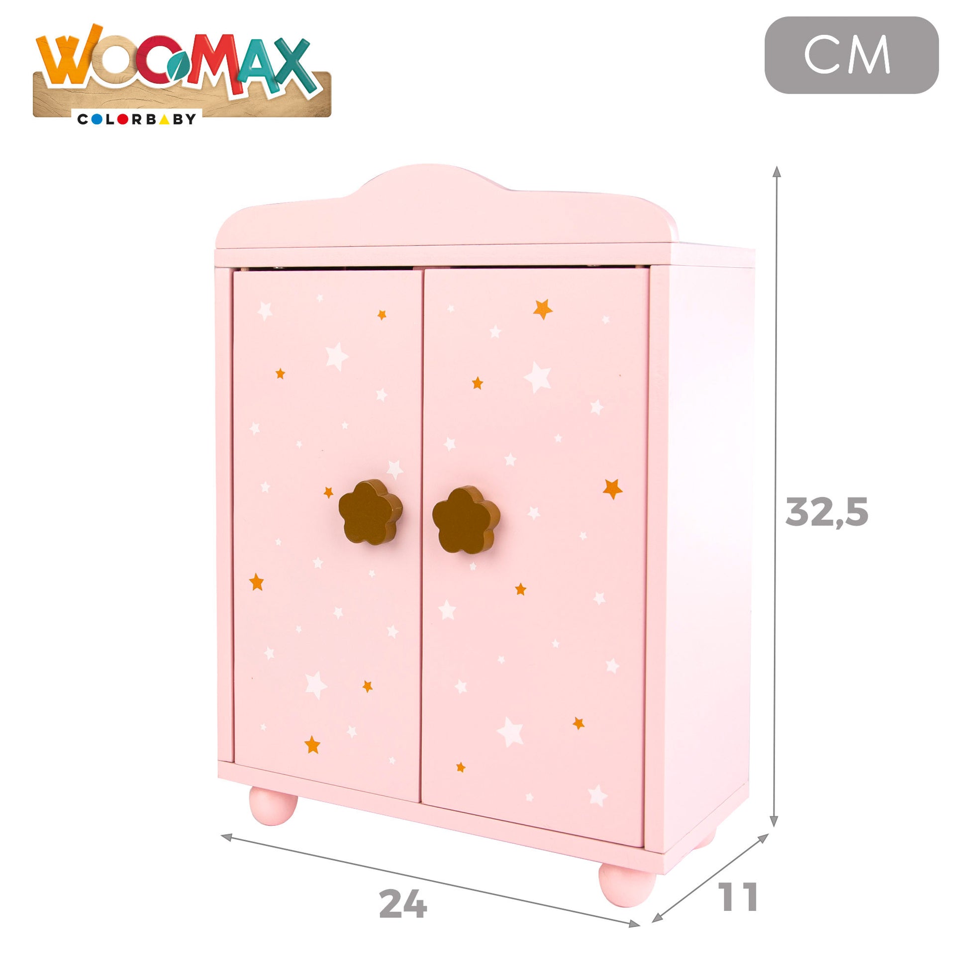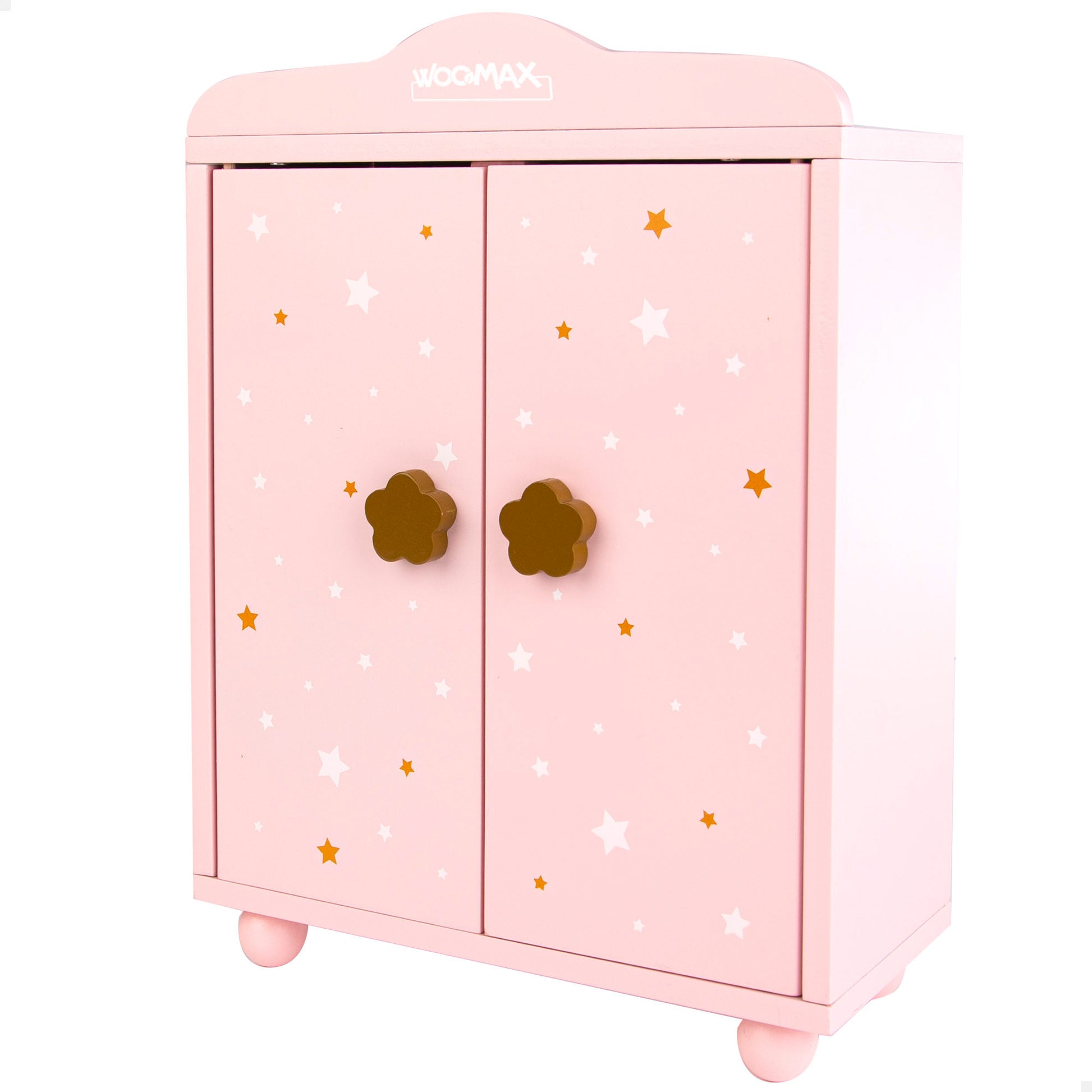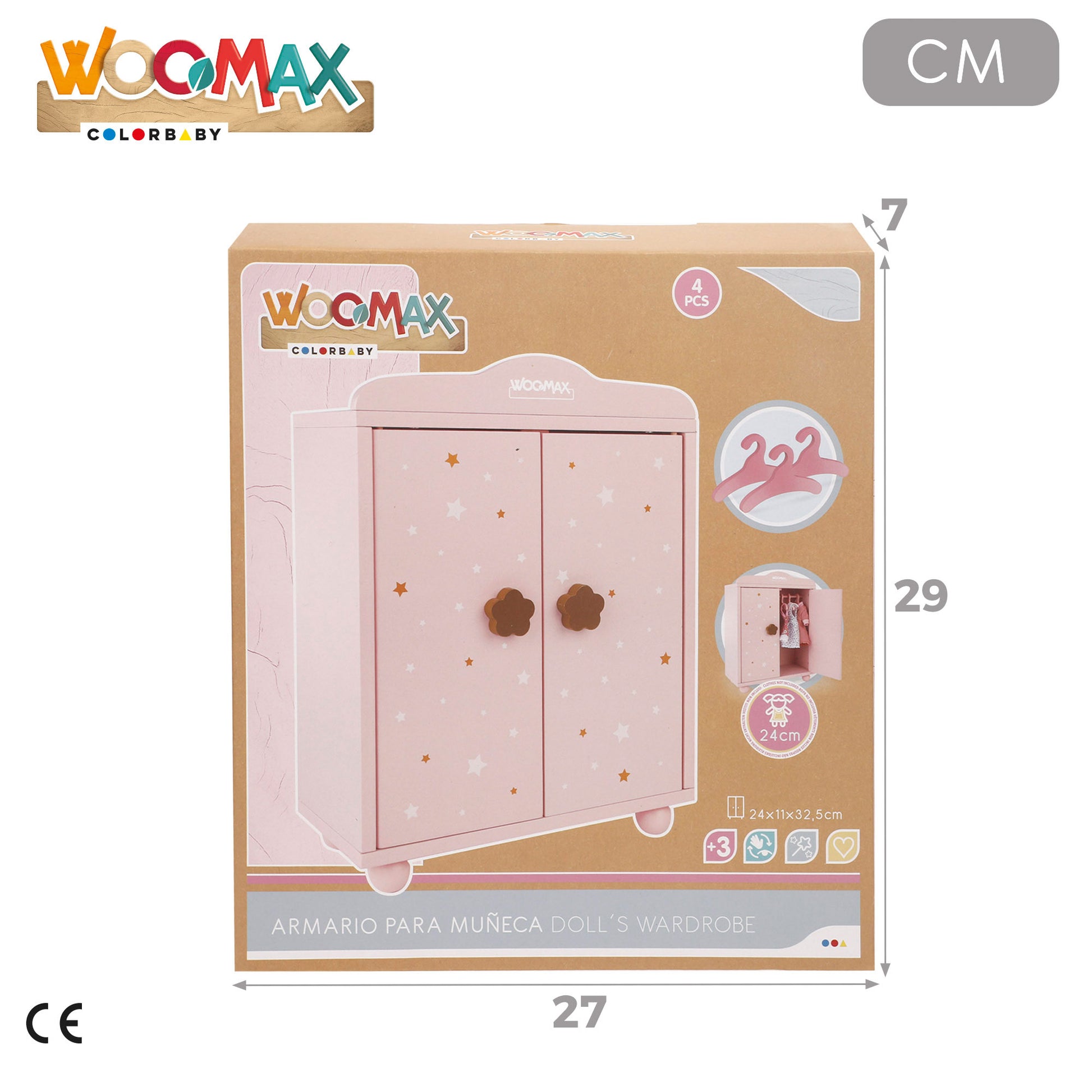Organiza toda la ropa de tu bebé muñeco en el armario de madera de WOOMAX. Diseñado en color rosa con estrellas. Incluye 3 perchas para colocar la ropita del bebé. El armario mide 24x11x32,5 cm ideal para la ropa de muñeco de 24 cm. Se recomienda para niños a partir de 3 años. Fomenta la afectividad, la imaginación y coordinación ojo-mano. Es un juguete adscrito a la iniciativa "Comparte y recicla", una acción solidaria de la Fundación Crecer Jugando cuyo objetivo es la recogida de juguetes para su donación a organizaciones benéficas españolas.
