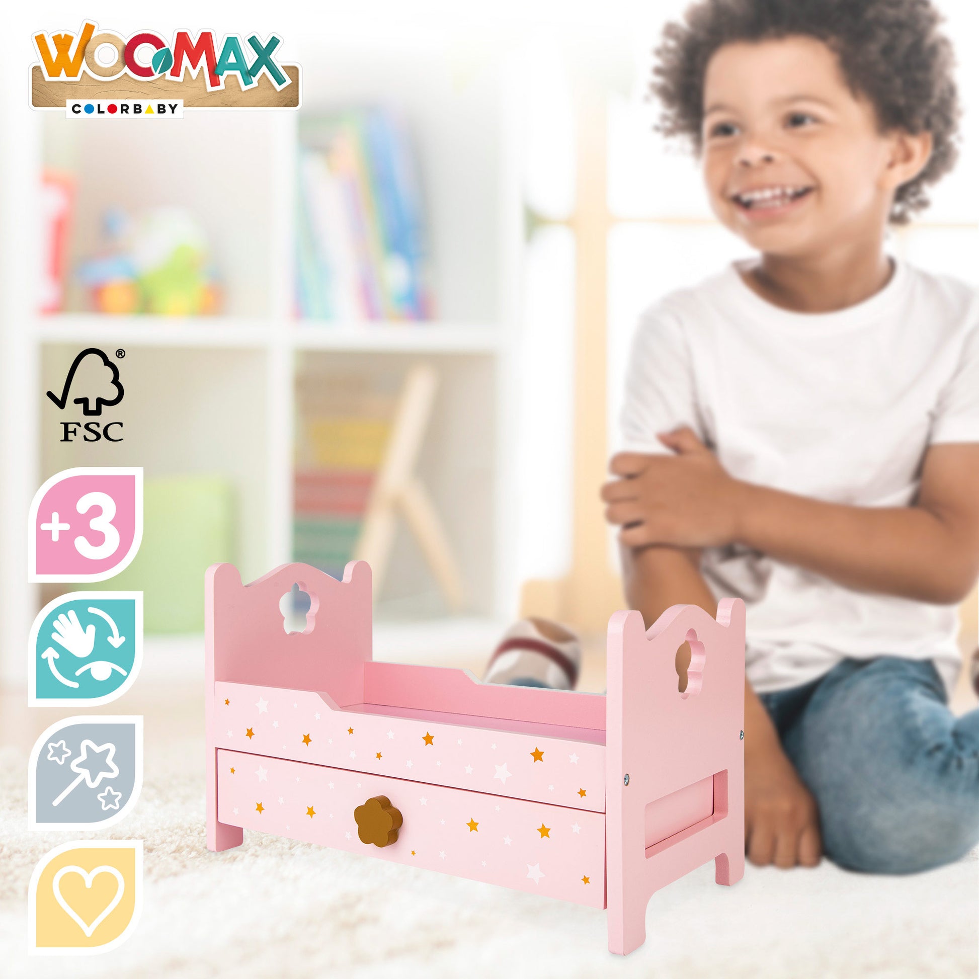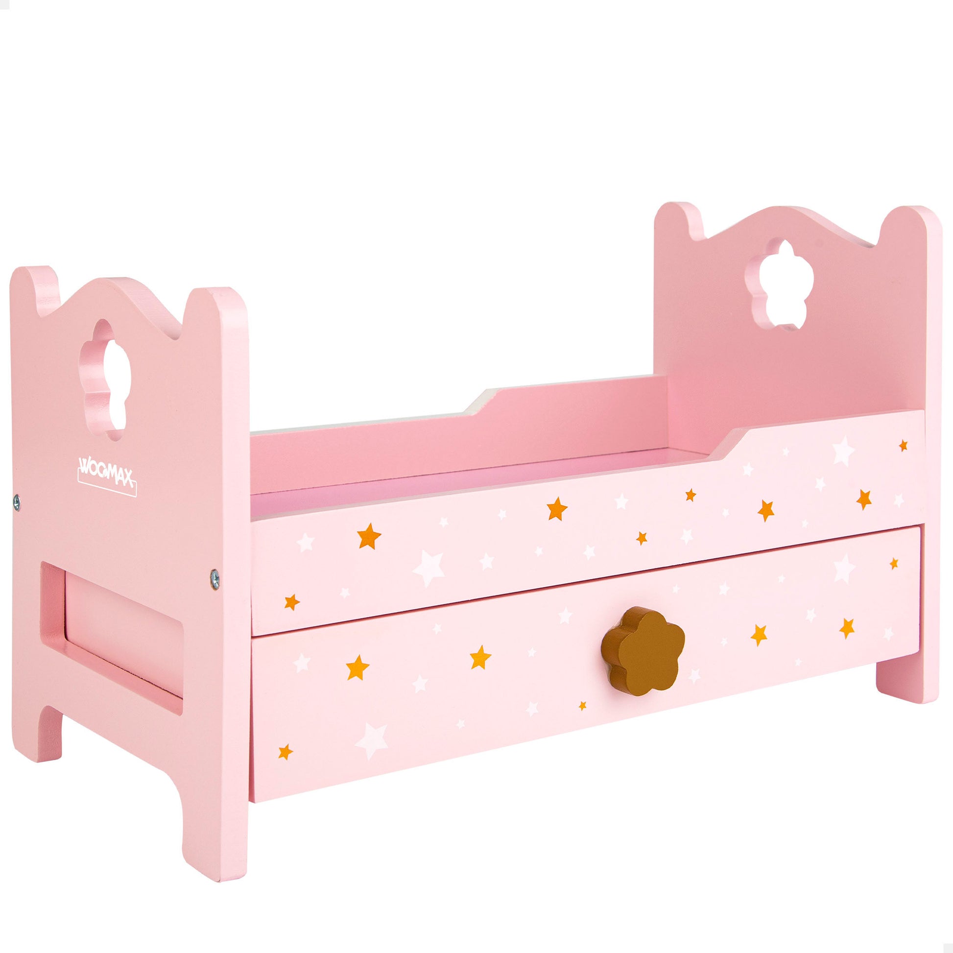 Duerme a tu bebé muñeco en esta preciosa y delicada camita de madera de WOOMAX. Su diseño en color rosa estampado con estrellitas la convierten en el lugar perfecto para acostar al bebé. La cama mide 31x16x20 cm y es perfecta para muñecos de 24 cm. Es un juguete recomendado para niñ@s a partir de 3 años. Fomenta la reproducción de roles adultos, ayuda a desarrollar la imaginación, favorece la expresión verbal, la afectividad y fomenta la habilidad manual.