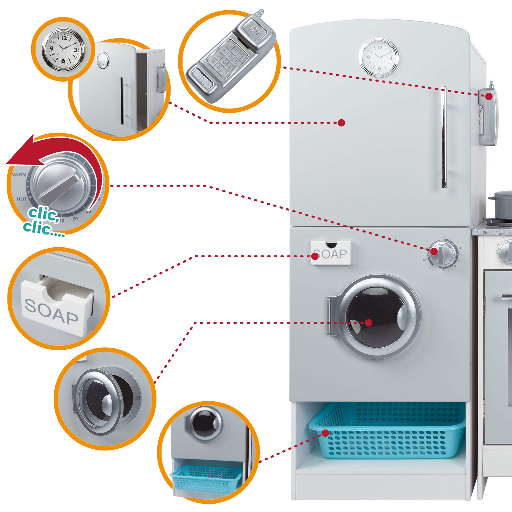 En el primer módulo, hay 2 electrodomésticos con puertas abatibles, el más grande es unanevera genial para guardar la compra. Además, tiene un pequeño reloj en la puerta y un teléfono de pared en un lateral para estar siempre conectado. Más abajo, la lavadora con compartimento para jabón, botones giratorios y un espacio inferior para dejar la cesta de la ropa, que se incluye como accesorio. ¡Un espacio de lavandería como los de verdad!