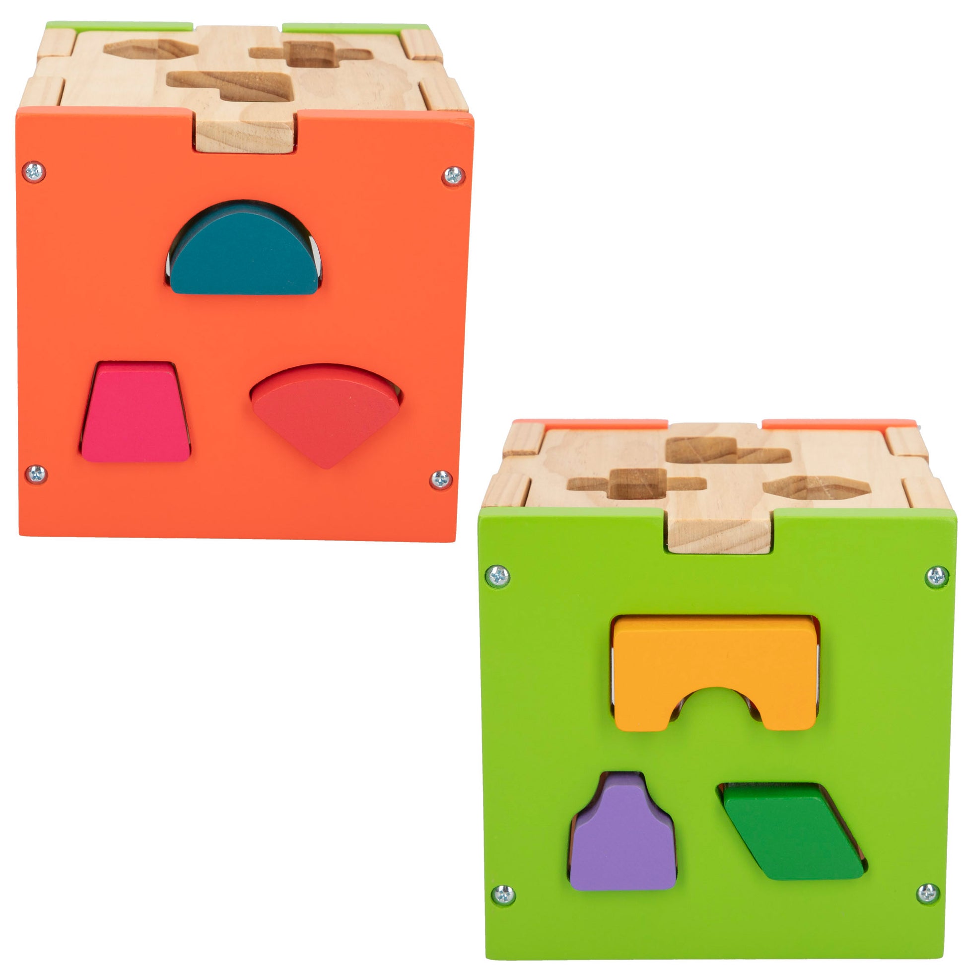 El cubo 15x15x15 cm va equipado con 14 figuras geométricas (triángulo, cuadrado, círculo, estrella, etc.) de diferente color (rojo, rosa, amarillo, violeta, verde, azul, etc.) para que el pequeño se divierta introduciendo las piezas por los huecos de la caja una y otra vez. Uno de los lados del cubo tiene una puertecita para abrir y sacar las piezas… ¡Cógelas y prueba a encajarlas de nuevo!