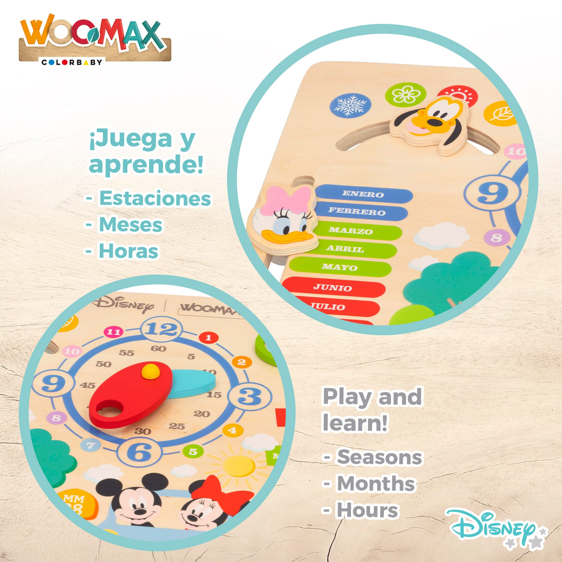 ¡Aprende las horas, los meses, las semanas, los días, las estaciones y el tiempo con este supertablero Disney! Juguete educativo WOOMAX fabricado en madera natural, reciclable y ecológica, con bordes redondeados y textura suave. Mueve las manecillas, gira o desplaza los elementos y diviértete mientras aprendes con los personajes de Disney más aclamados: Mickey, Minnie, Donald, Daisy y Pluto. Las medidas del tablero son 30x30x3,5cm y está recomendado a partir de 5 años.