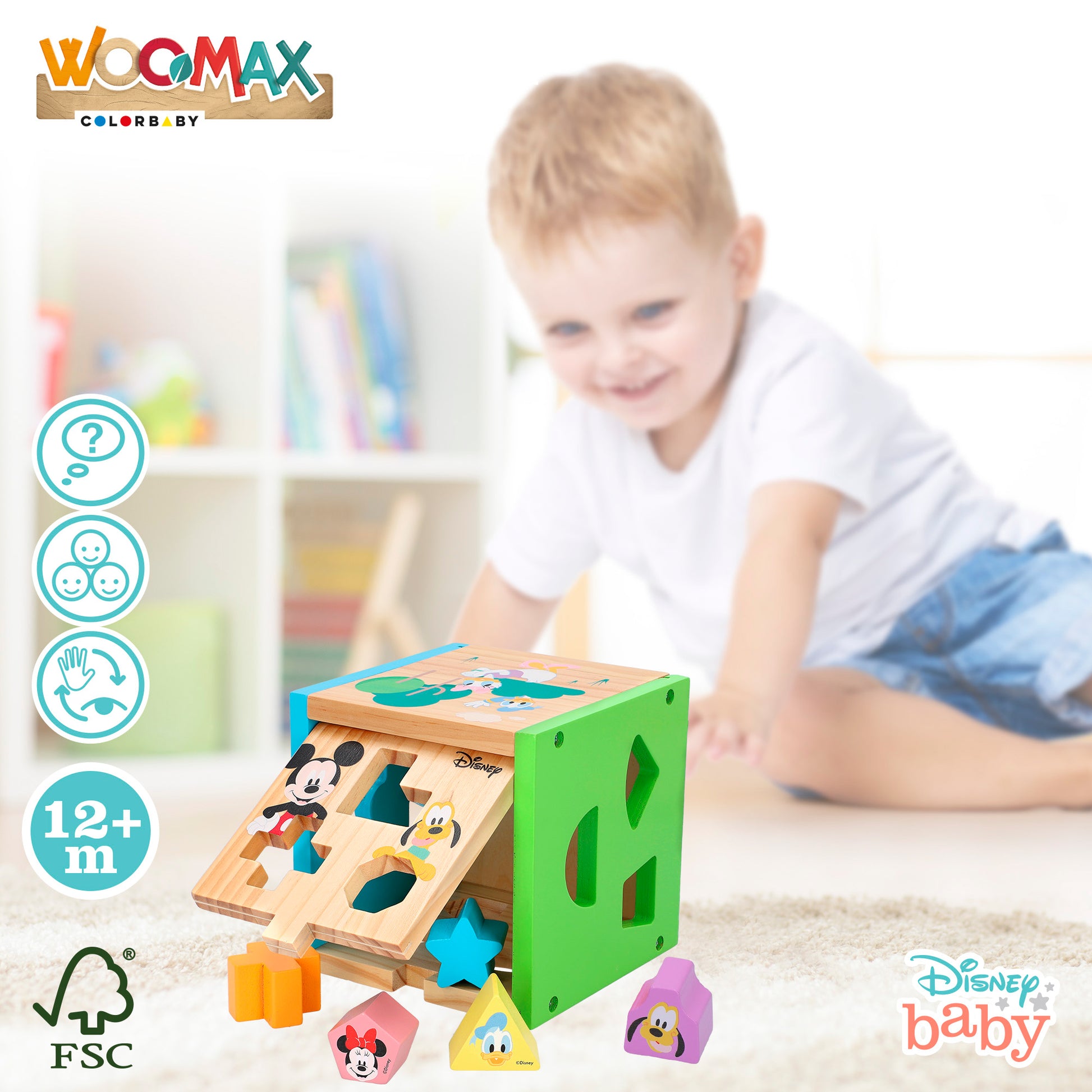 ¿En qué hueco va Minnie? ¿Dónde cabe Pluto? Con este cubo de madera con formas encajables de diferentes colores y decorado con los clásicos Disney aprenderán de forma divertida mientras juegan. El cubo incluye 13 piezas de madera de diferente color y forma, 5 de ellas decoradas con personajes Disney. Además, algunas de sus caras están decoradas con estos personajes para que den rienda suelta a su imaginación y uno de los lados se abre para guardar o sacar las piezas y jugar de nuevo. Un juguete de madera atemporal con el que desarrollan la motricidad fina, el razonamiento y el pensamiento lógico. Recomendado a partir de 12 meses.