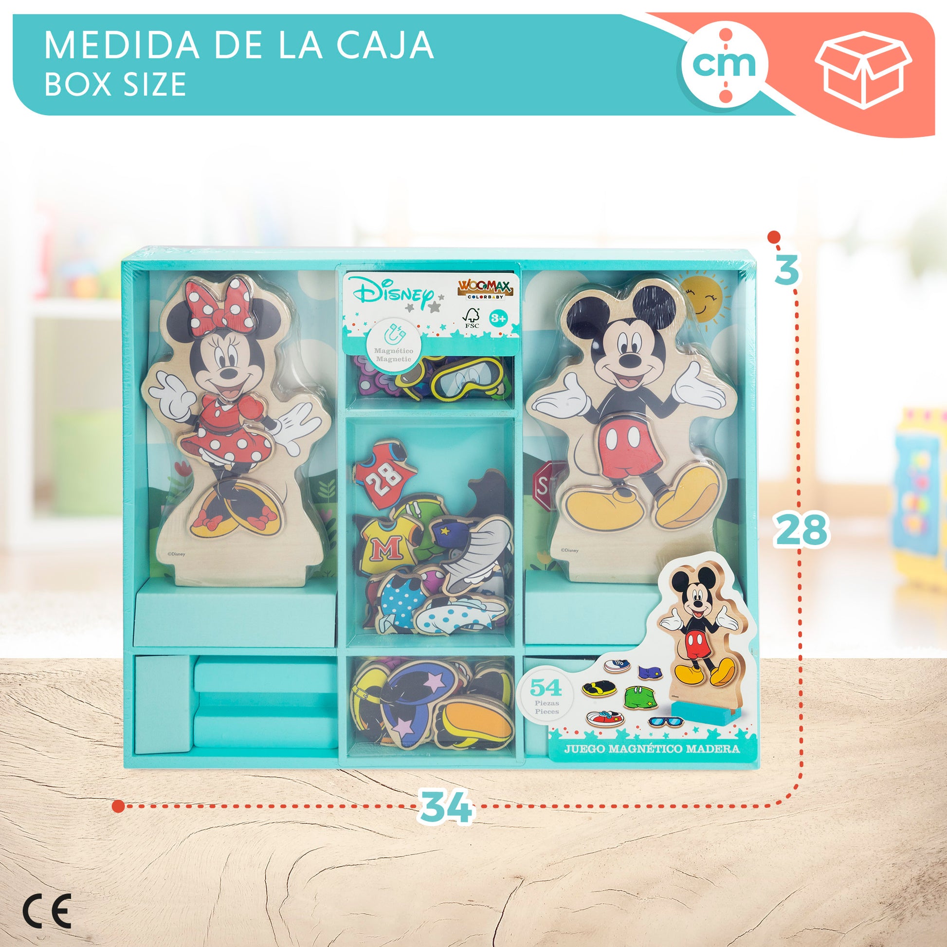 ¡Viste a los ratones más famosos de planeta con el armario lleno de ropa y accesorios WOOMAX Disney! Juego de 54 piezas magnéticas de madera natural para jugar con Mickey y Minnie. Las dos figuras incorpora soporte para mantenerlas de pie con medidas 34x28 cm. Recomendado para niños a partir de 3 años.