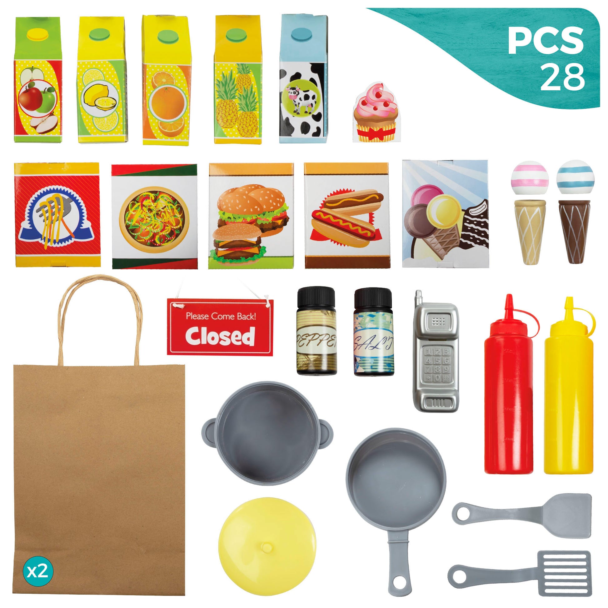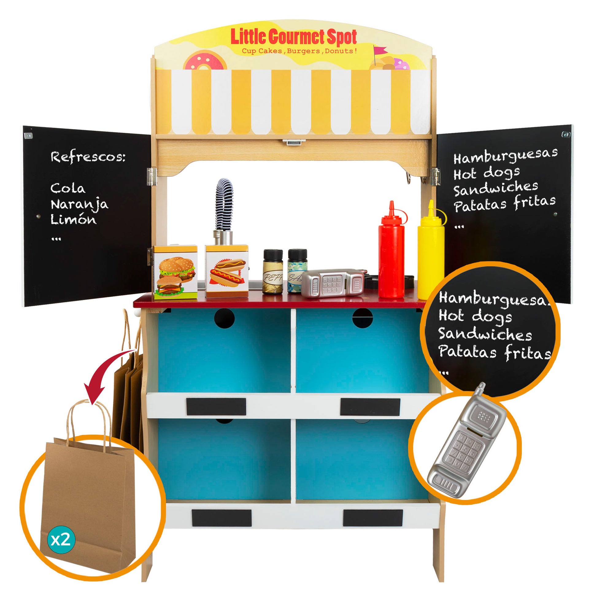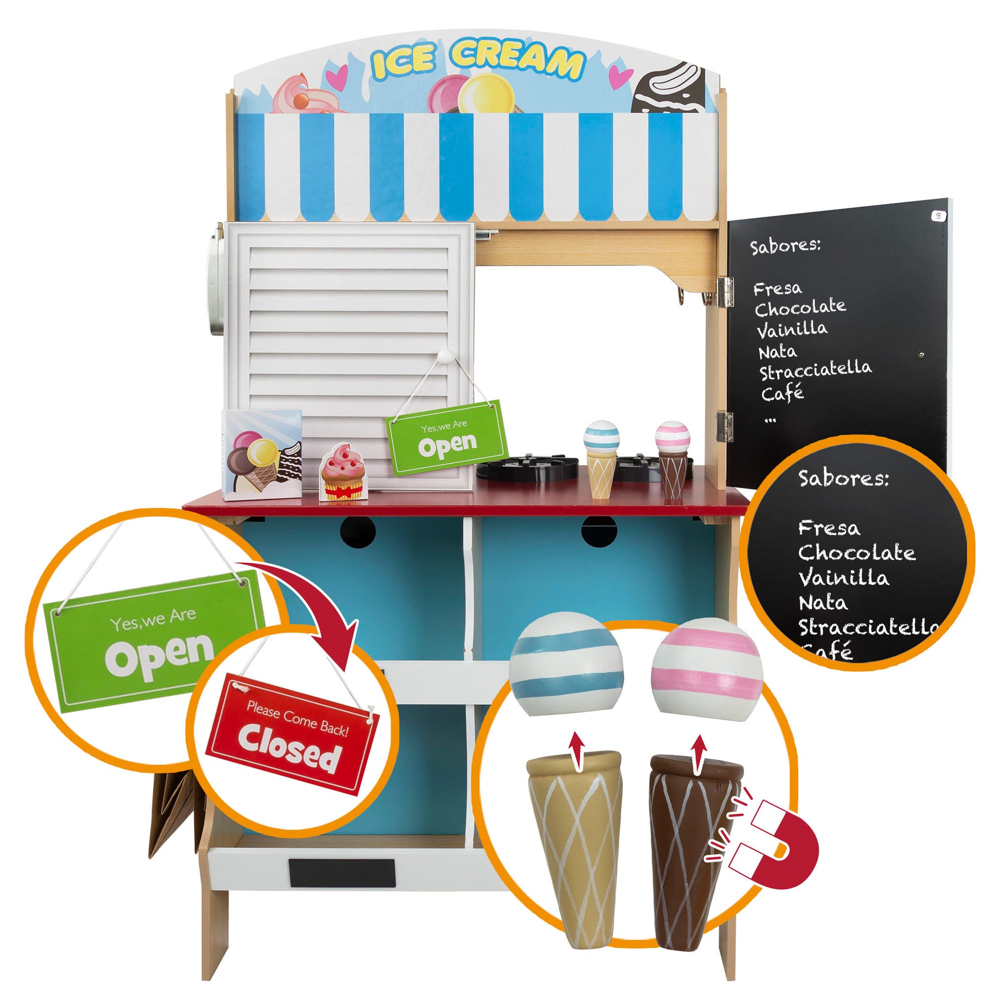 El juguete incluye más de 20 accesorios, como utensilios de cocina, comida de juguete y complementos para la heladería. La cocinita de madera está equipada con electrodomésticos como horno, nevera y microondas, todos ellos con puertas que se abren. También hay un fregadero con grifo de estilo industrial, una barra con ganchos para colgar utensilios de cocina y un reloj con las agujas movibles en el lateral. La heladería tiene cuatro huecos para colocar los productos de la tienda y una barra con dos agujeros para colocar los conos de helado. En el lateral hay un colgador para bolsas y tiene una ventana abatible que comunica la cocina con la heladería que es, además una pizarra.