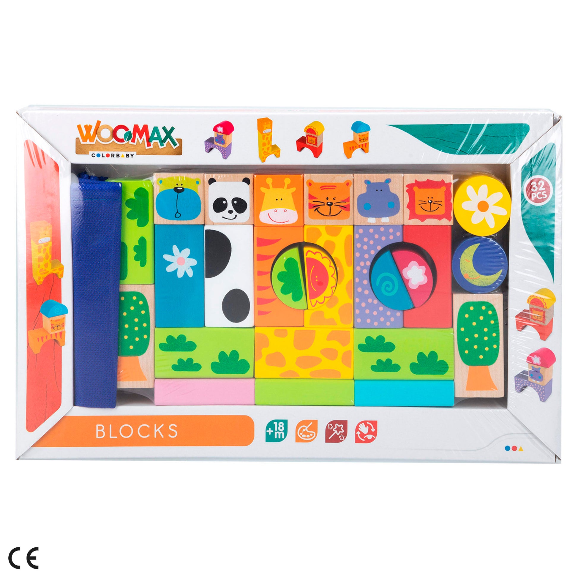 Juego de bloques de madera con diseño de animales WOOMAX. El juego contiene 32 piezas de diferentes formas y colores con las que hacer construcciones. ¡Podrás construir todo lo que imaginas! Todas las piezas son de madera natural pintadas de colores. Incluye bolsa de tela para guardar todas las piezas. Con este juego los niños desarrollan la imaginación, la lógica, la coordinación mano-ojo y la motricidad fina. Recomendable a partir de loes 18 meses. Es un juguete adscrito a la iniciativa "Comparte y recicla", una acción solidaria de la Fundación Crecer Jugando cuyo objetivo es la recogida de juguetes para su donación a organizaciones benéficas españolas.