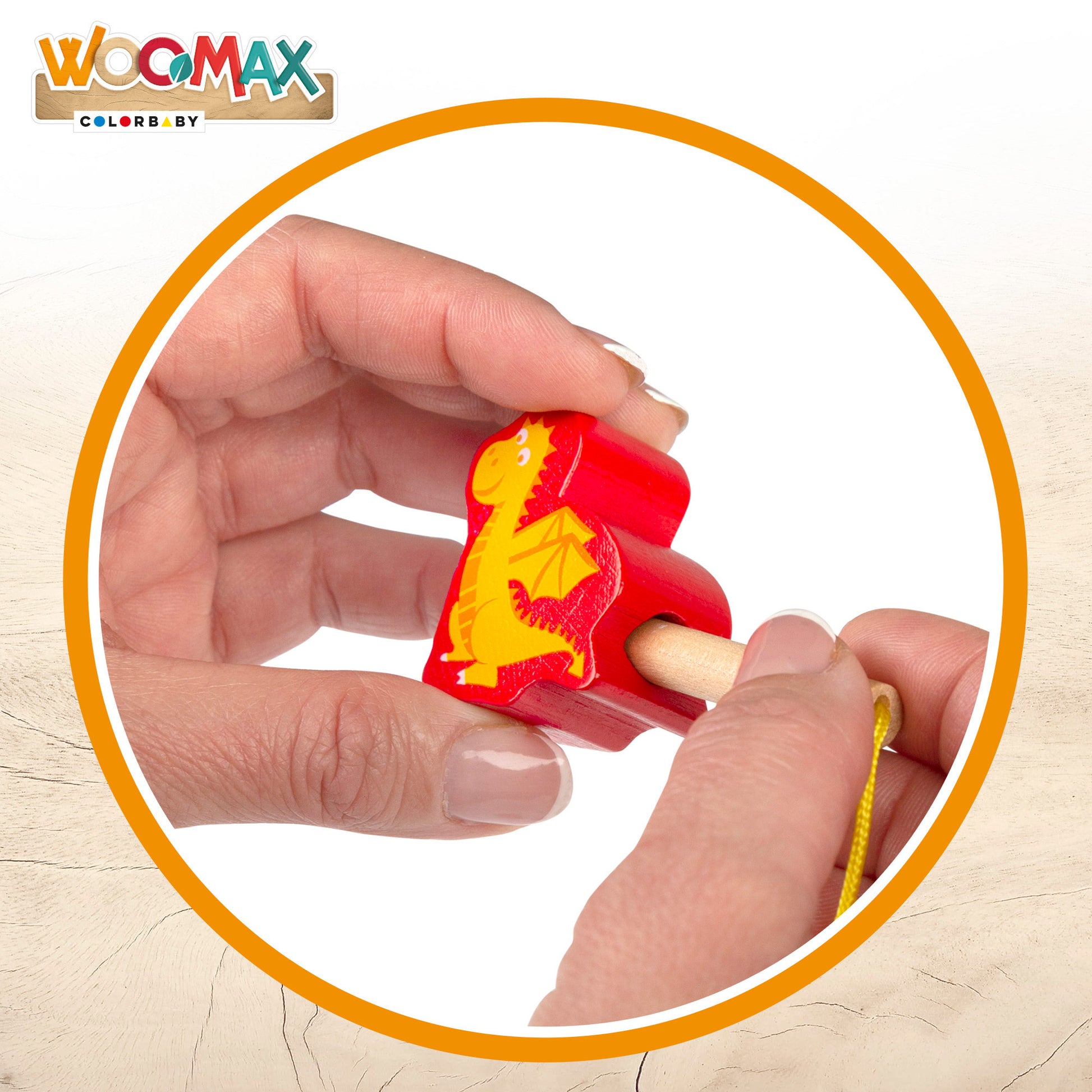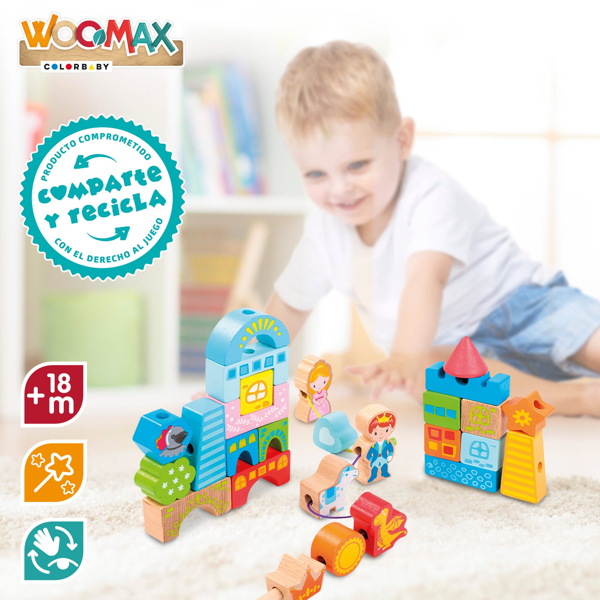 Juego de construcción con bloques de madera WOOMAX para construir un bonito castillo. Incluye 32 piezas con 5 personajes: príncipe, princesa, caballito, dragón y pájaro. Cada pieza tiene un agujero para pasar el cordel y formar un trenecito que podrá desplazar con el palito del extremo. Juego sostenible 100% madera y seguro, con bordes redondeados y suaves. Recomendado a partir de 18 meses.
