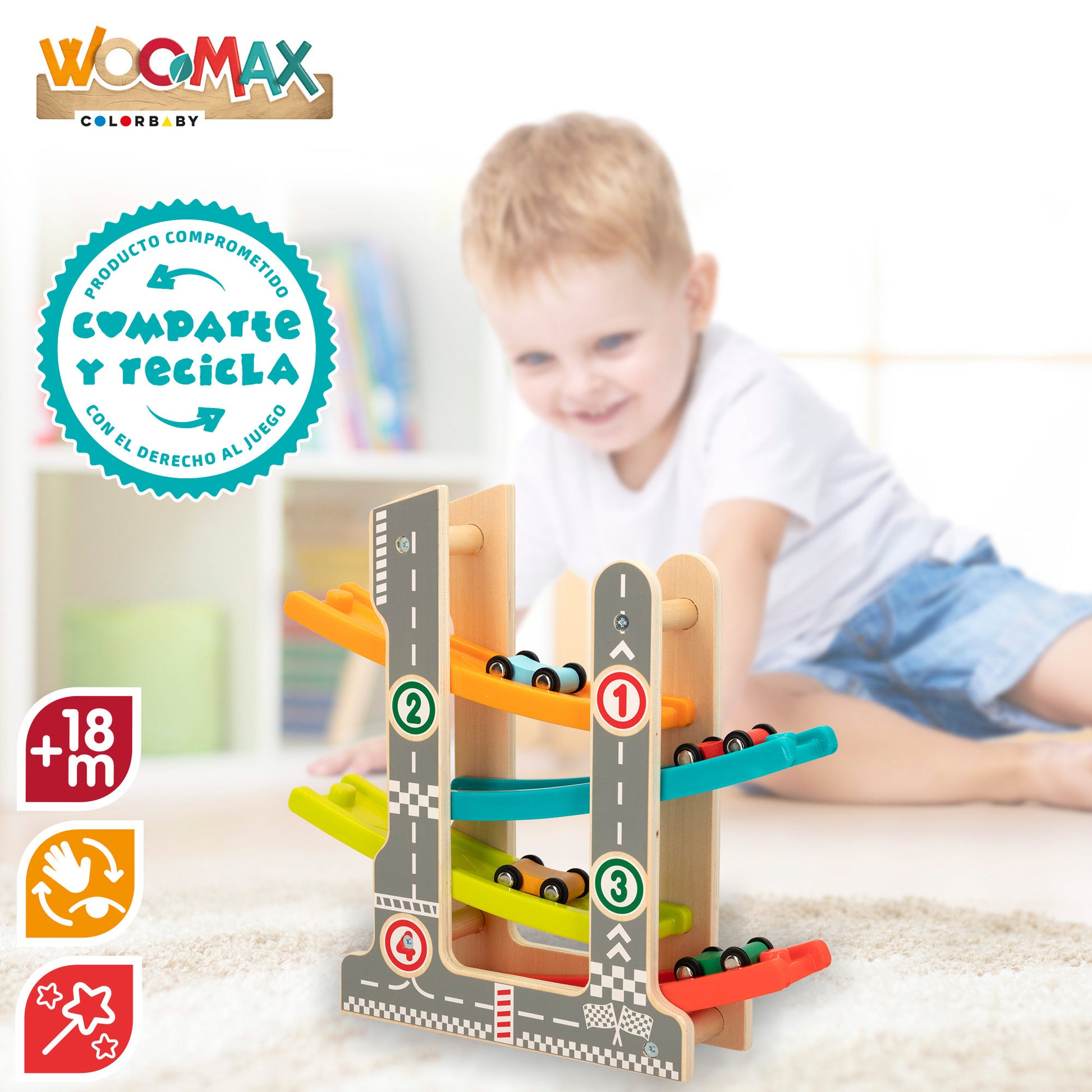 ¡Sé el primero en llegar a la meta con esta pista de coches roller WOOMAX fabricada con madera natural! Contiene 5 piezas compuestas por una pista de cuatro alturas y cuatro rampas de colores distintas y cuatro cochecitos, cada uno de un color: azul, rojo, naranja y verde. La pista tiene unas medidas de 30 x 28 cm y cada coche mide 3,2 x 4,2 cm. Este juego desarrolla la destreza, la coordinación ojo-mano y la imaginación. Está recomendado a partir de los 18 meses y es un juguete adscrito a la iniciativa "Comparte y recicla", una acción solidaria de la Fundación Crecer Jugando cuyo objetivo es la recogida de juguetes para su donación a organizaciones benéficas españolas.