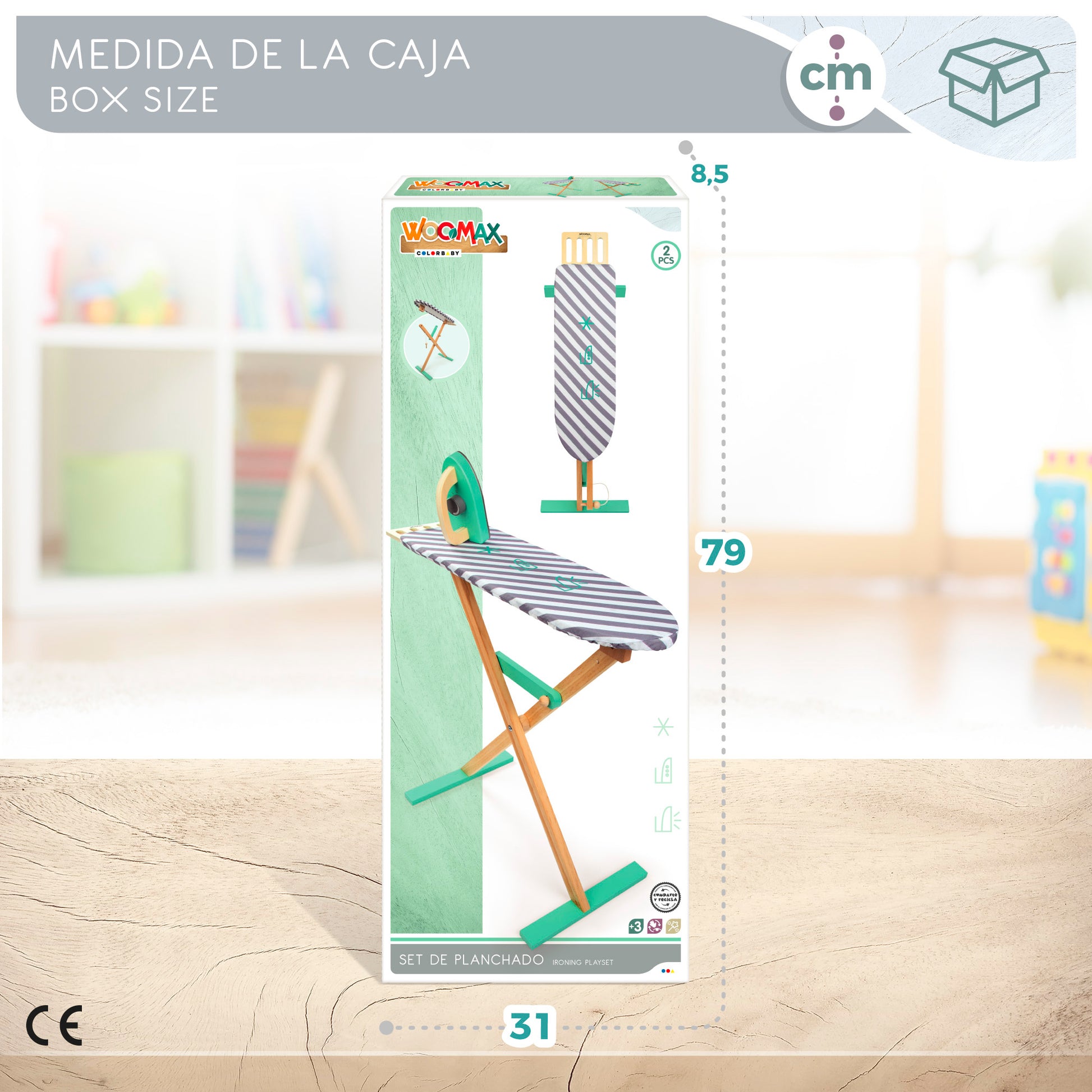 Aprende las tareas del hogar con los juguetes de madera WOOMAX. Esta tabla de planchar de madera está diseñada en colores claros, verde agua y gris en combinación con la madera natural, ideal para aprender los roles del hogar y cuando no juegues con ella se pliega y al rincón de la habitación. La plancha tiene rueda con sonido mecánico. Se recomienda para niños a partir de los 3 años. Es un juguete adscrito a la iniciativa "Comparte y recicla", una acción solidaria de la Fundación Crecer Jugando cuyo objetivo es la recogida de juguetes para su donación a organizaciones benéficas españolas.
