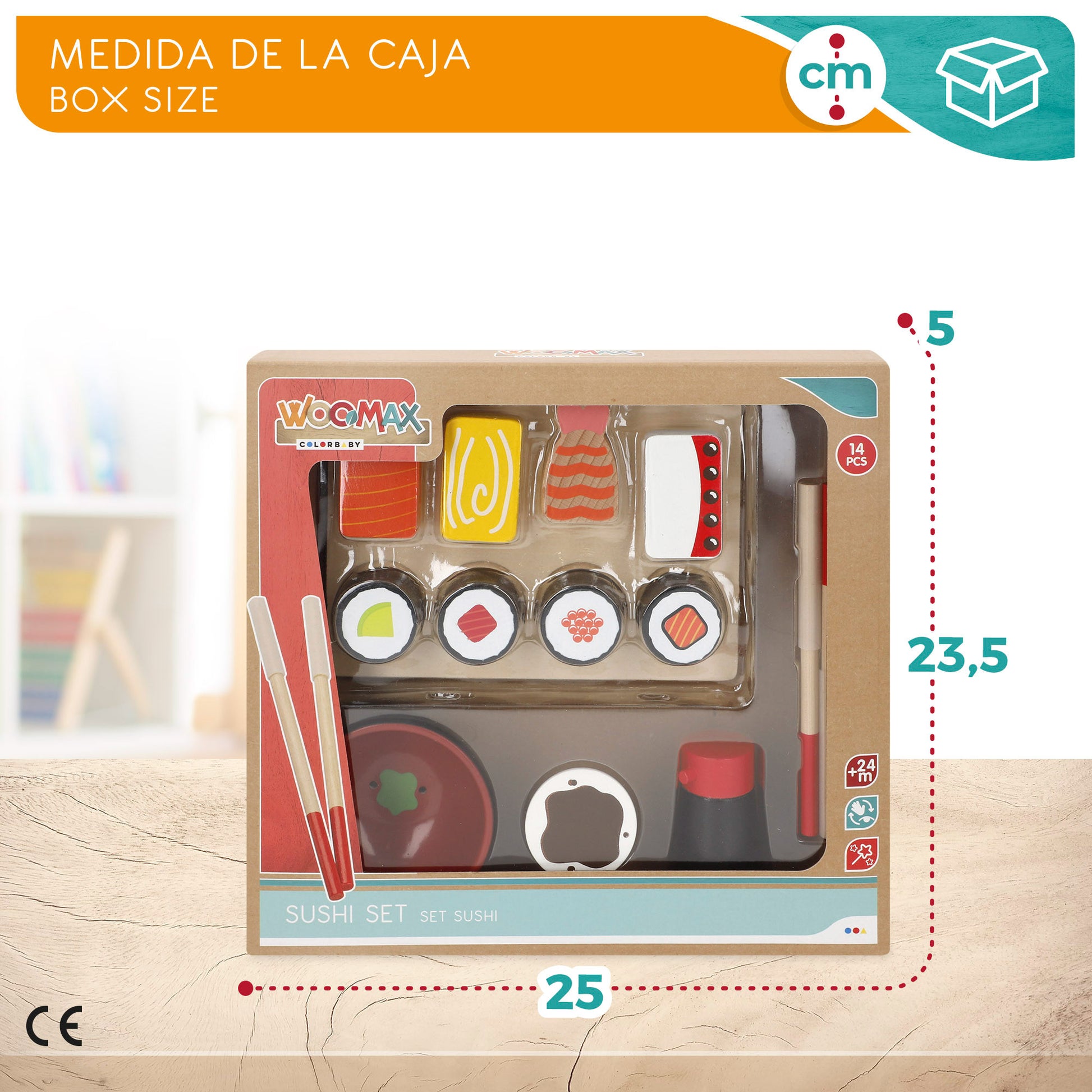 ¡Mmm... qué rico! Si eres un adicto al sushi este set de comida japonesa no puede faltar entre tus juguetes. Fabricado con madera natural de WOOMAX. Incorpora 14 piezas de madera: 2 palillos, 1 cuenco, 1 bandeja, 8 piezas de sushi diferentes, 1 bote de soja y 1 plato con soja. Se recomienda para niños a partir de 2 años. Fomenta la imaginación y el descubrimiento de otros alimentos. Es un juguete adscrito a la iniciativa "Comparte y recicla", una acción solidaria de la Fundación Crecer Jugando cuyo objetivo es la recogida de juguetes para su donación a organizaciones benéficas españolas.